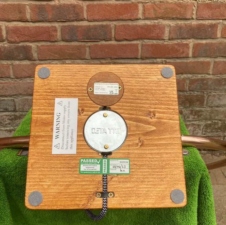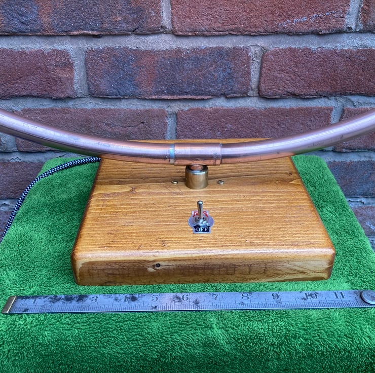 All joints in the copper pipework are soldered together in the traditional way (no cheating with glue) so there may be some surplus solder around the joints and as the copper pipe is reclaimed it comes with some small dents from its previous life. Once soldering was finished, the wiring was run through the pipework. The lamp is secured onto a base made from reclaimed scaffold plank which I have sanded and French polished to give a nice sheen, it has an integral toggle switch and stands on four felt pads to protect your furniture.