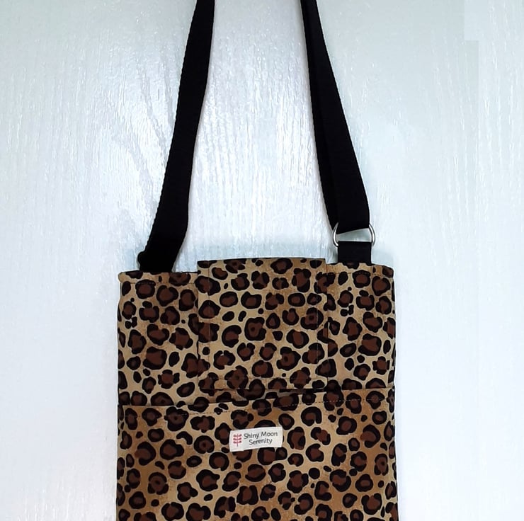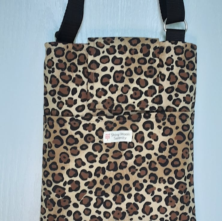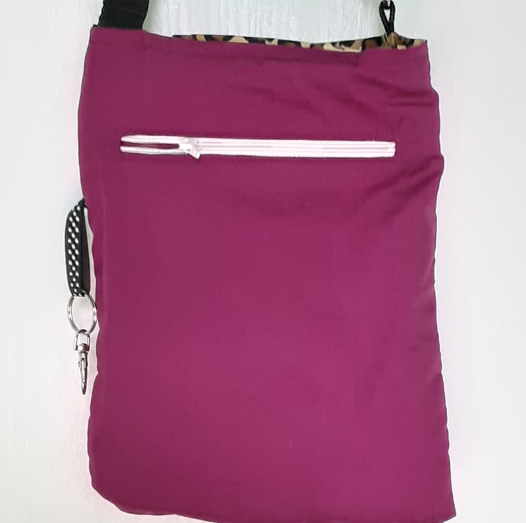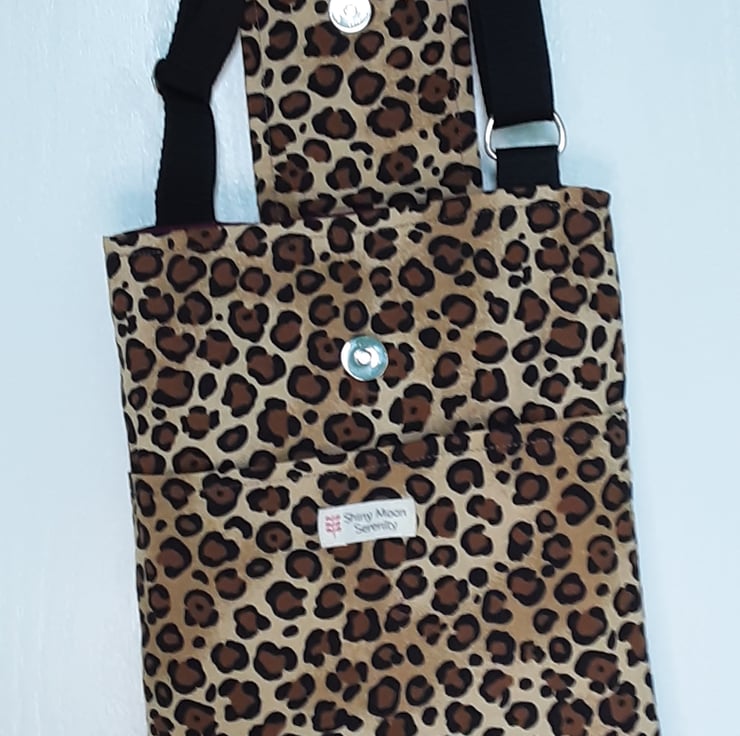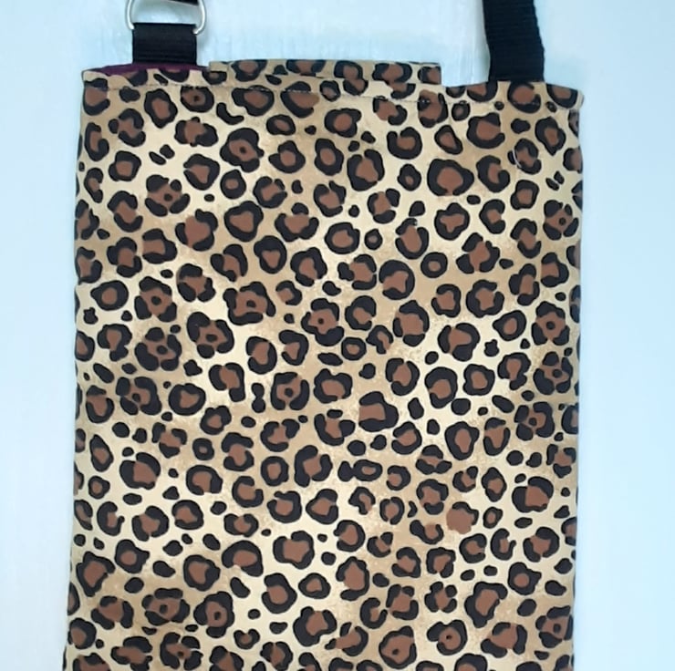 The front, back and pocket panels are made from leopard print cotton fabric. The lining is made from magenta poly-cotton fabric.