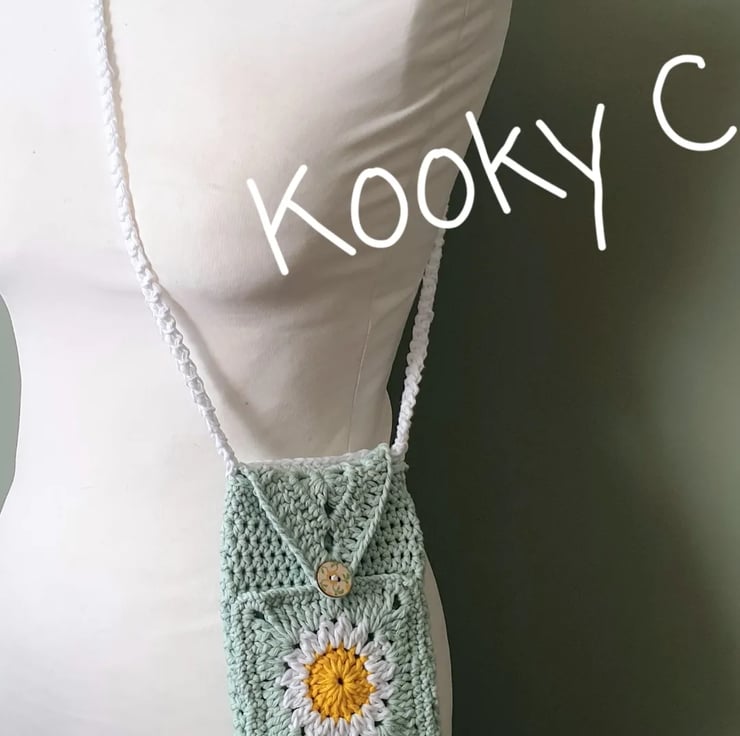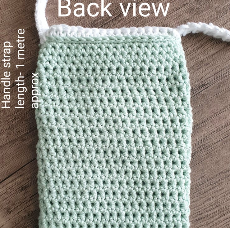 This crochet phone bag is my own design. It has a pocket on the front. The size is approx 4 x 7 inches. The handle is approx 1 metre.