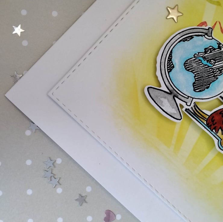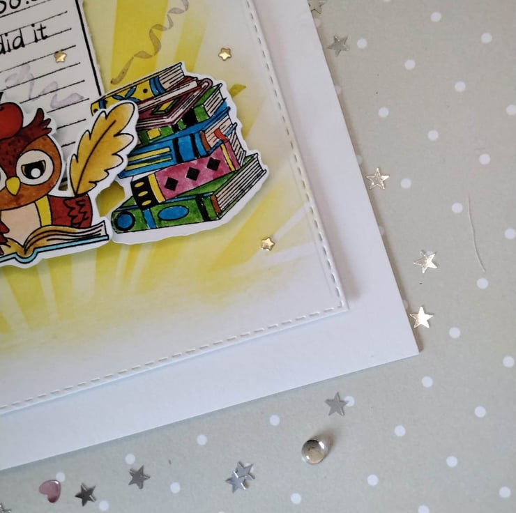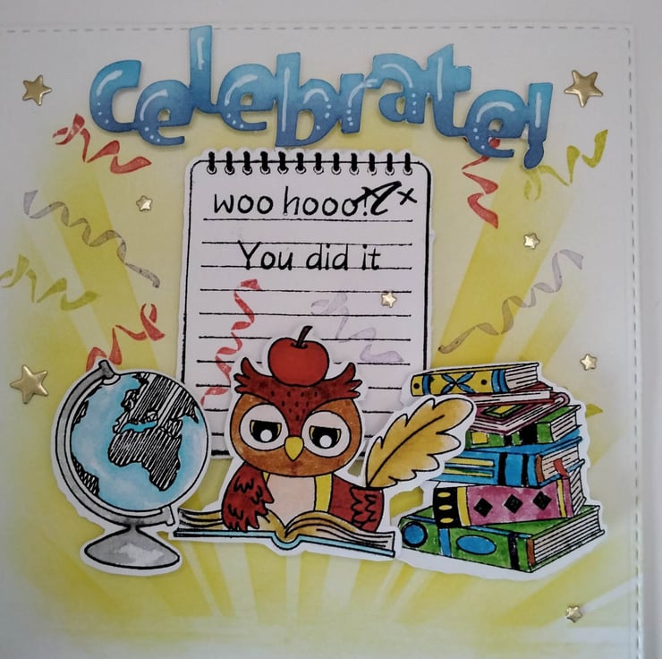 Hand-made, unique, luxury, personalized graduation, exam card, 300gsm card base, 7" 7" square card, with envelope. Features of this card are; a stenciled inked background of a sunburst, with hand-stamped cute character images of study, with hand-stamped party streamers, petite foiled stars, the word 'celebrate' 'woo hoo, you did it. Personalized for free, please contact me before placing your order, to discuss this, please check spelling/punctuation, many thanks Karen.