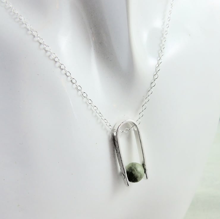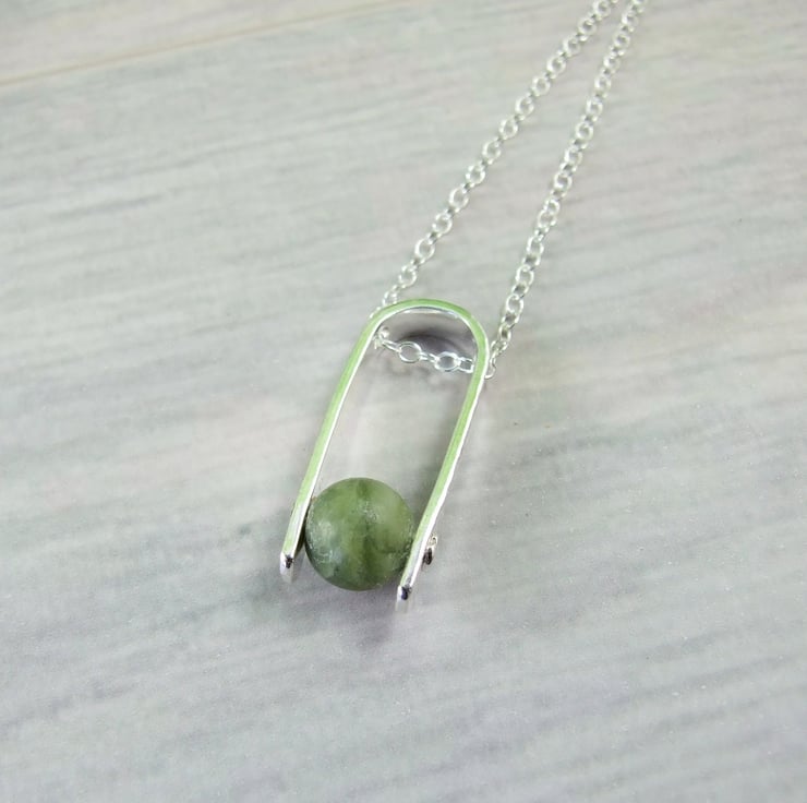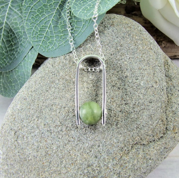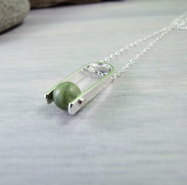 I have created the pendant bail from sterling silver sheet cut to length textured with a floral pattern drilled through and shaped into a 'U'. I have then added an 8mm Nephrite Jade gemstone bead securely held in place with a sterling silver rivet. Fitted to an 18 inch .925 Sterling Silver Chain.