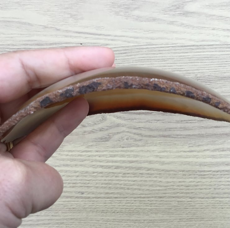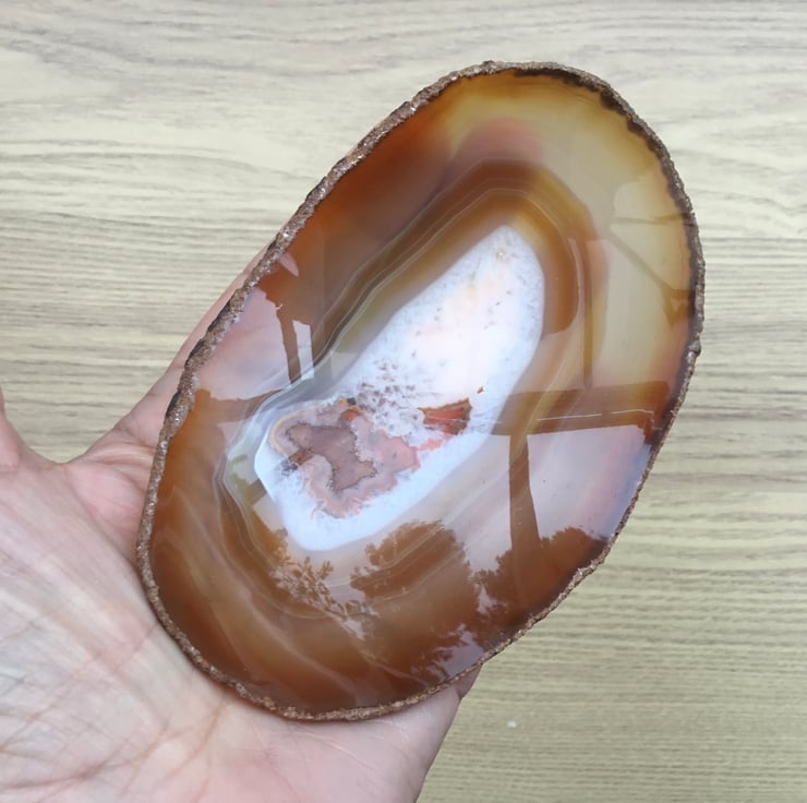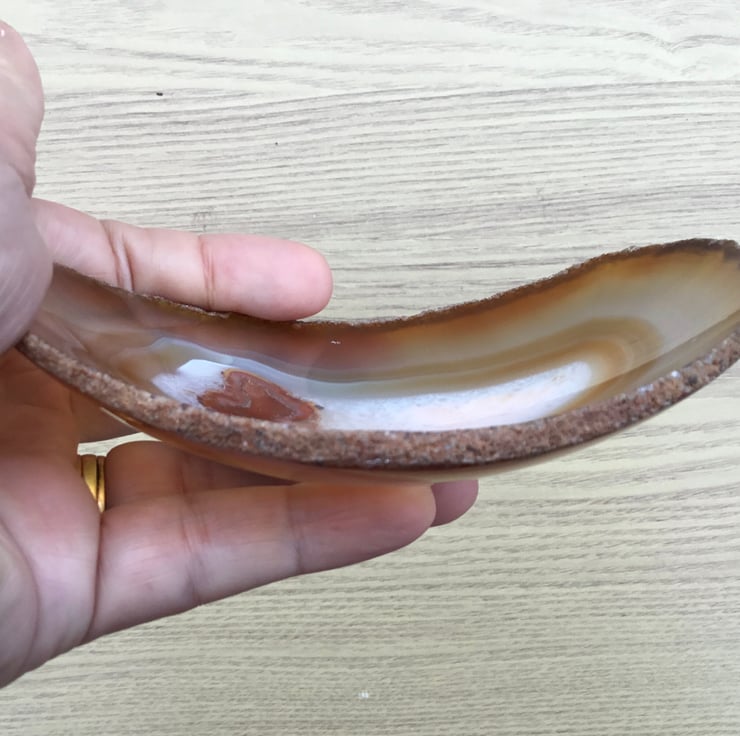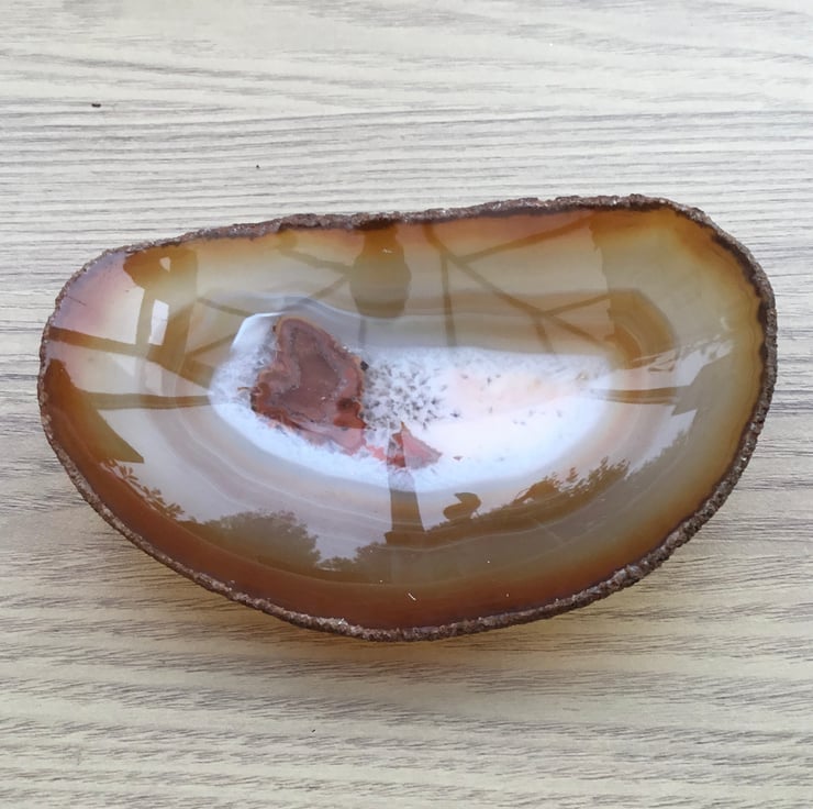 The pretty Agate geode is translucent when held up to the light, with wide and narrow bands and swirls of brown, Amber, russet and an almost white translucent lines separating the shades. The edge of the geode dish is not polished and left naturally rough. The base has a thicker flattened section to allow it to sit steadily.