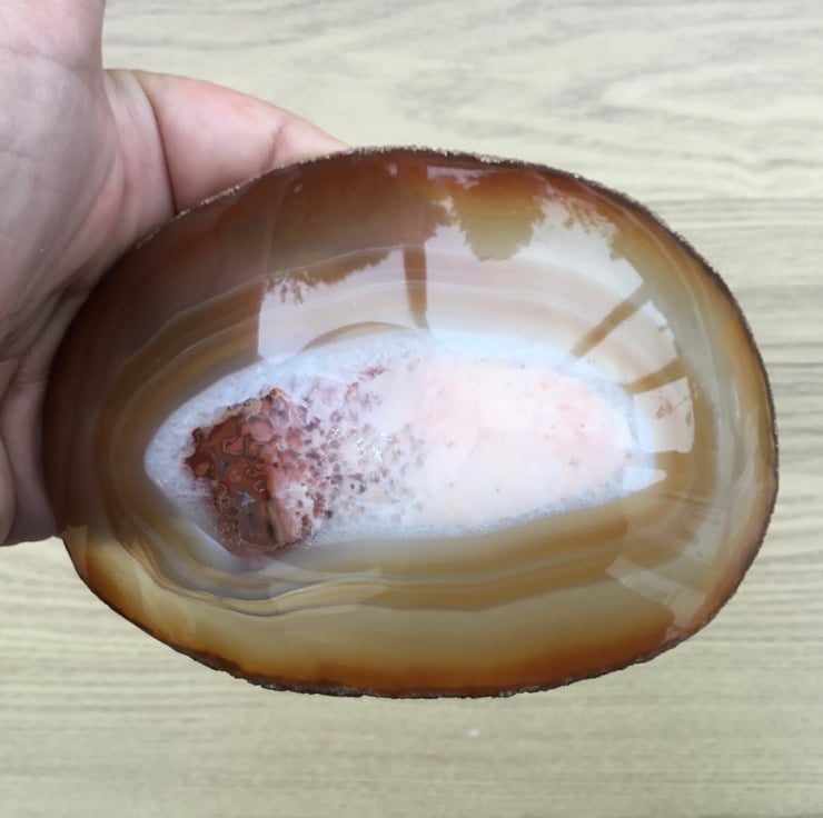 A superb and substantially large polished agate geode which has been carved and polished to create a shallow trinket dish, this would make a wonderful gift for a collector, suitable for display, photographic prop, or just adding to a collection