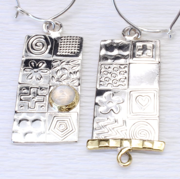 These earrings are handmade from sterling silver and feature a lovely 6mm white moonstone set in a brass bezel. They are the largest of three pairs of earrings that we make in our Asymmetrical jewellery range, one earring features a gemstone and the other has a decorative brass bar and hoop running along the bottom. They measure 14mm x 30mm and have a total drop length of 38mm including the ear wires.