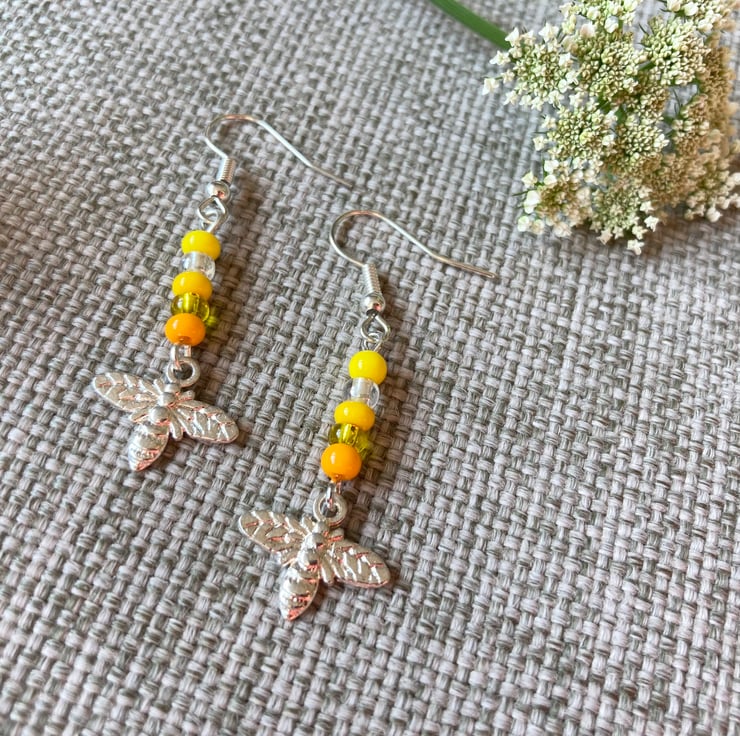 Pretty earrings made with yellow mix seed beads, a silver-plated bee charm and silver-plated earring hooks. The earrings are approximately 5cm in length including the hook. Matching necklace and bracelet also available.