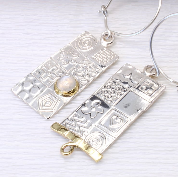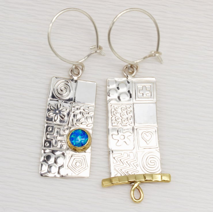 These asymmetrical earrings have been handmade by us in our workshop in Yorkshire. They are the largest of three pairs of earrings that we make in our Asymmetrical jewellery range and measure 14mm x 30mm and have a total drop length of 38mm, including the sterling silver ear wires. They are made from sterling silver and feature a lovely lab. grown 6mm blue opal triplet gemstones set in a brass bezel. One earring has a gemstone and the other has a decorative brass bar and hoop along the bottom.