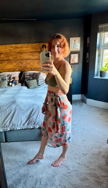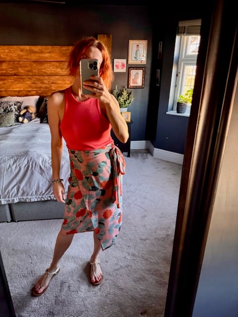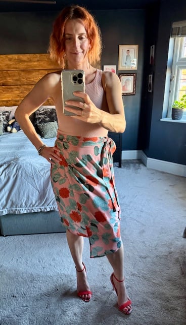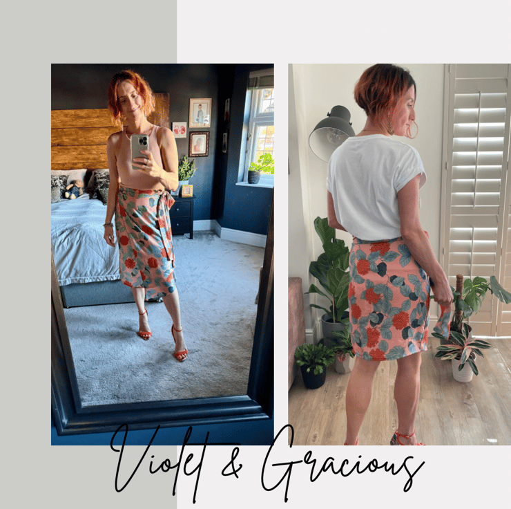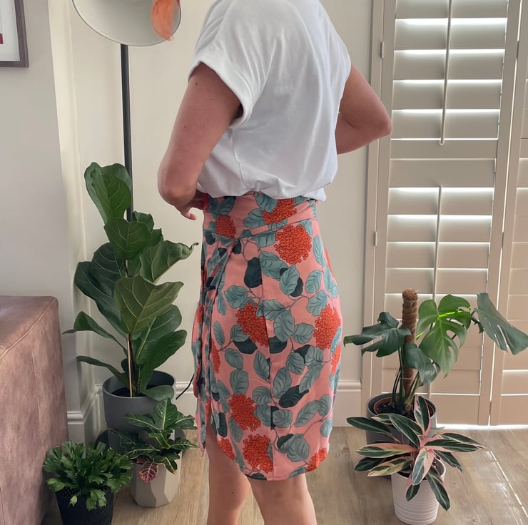 Inspired by the Alexus Vegan Leather Wrap Skirt. Our Winnie Hydrangea Wrap Skirt is a lighter, summery version. This skirt comes in 3 lengths - short, below the knee and midi.