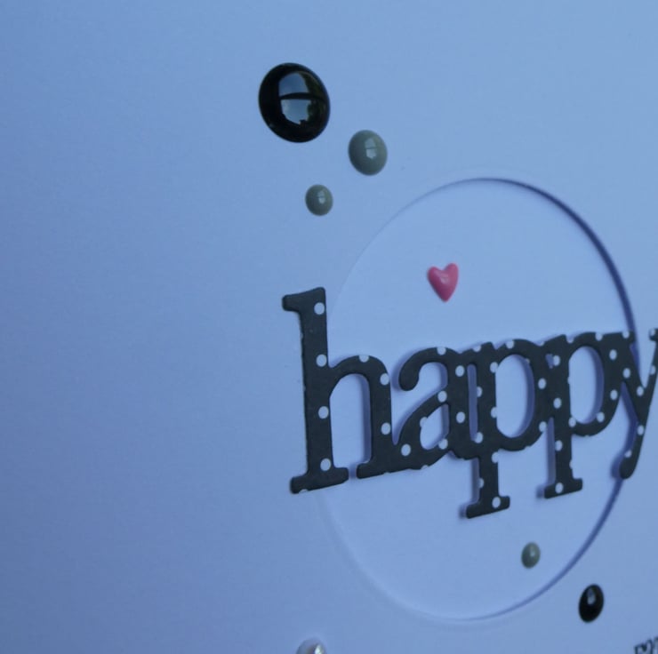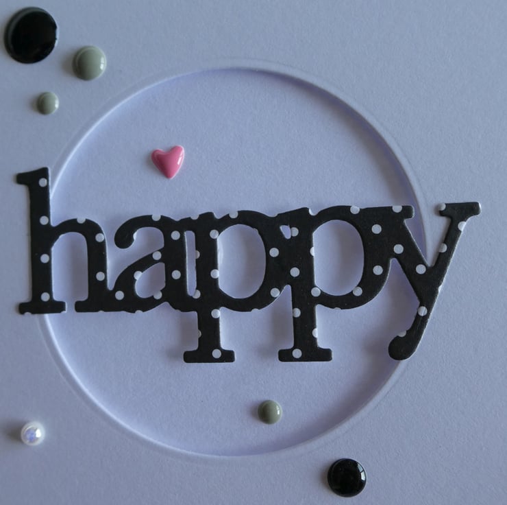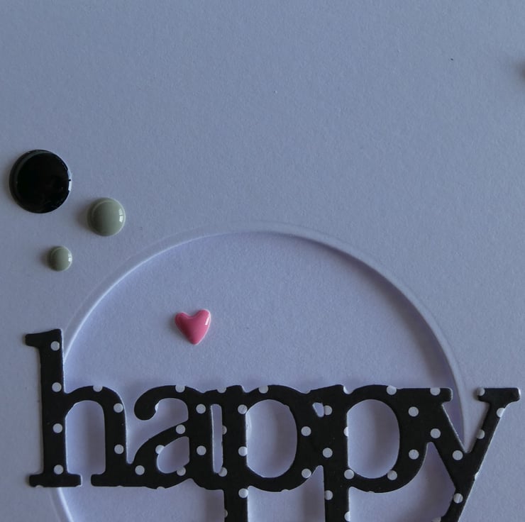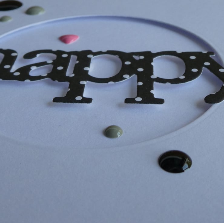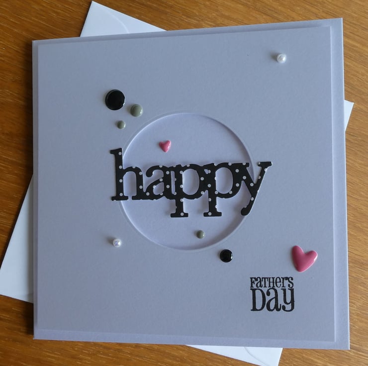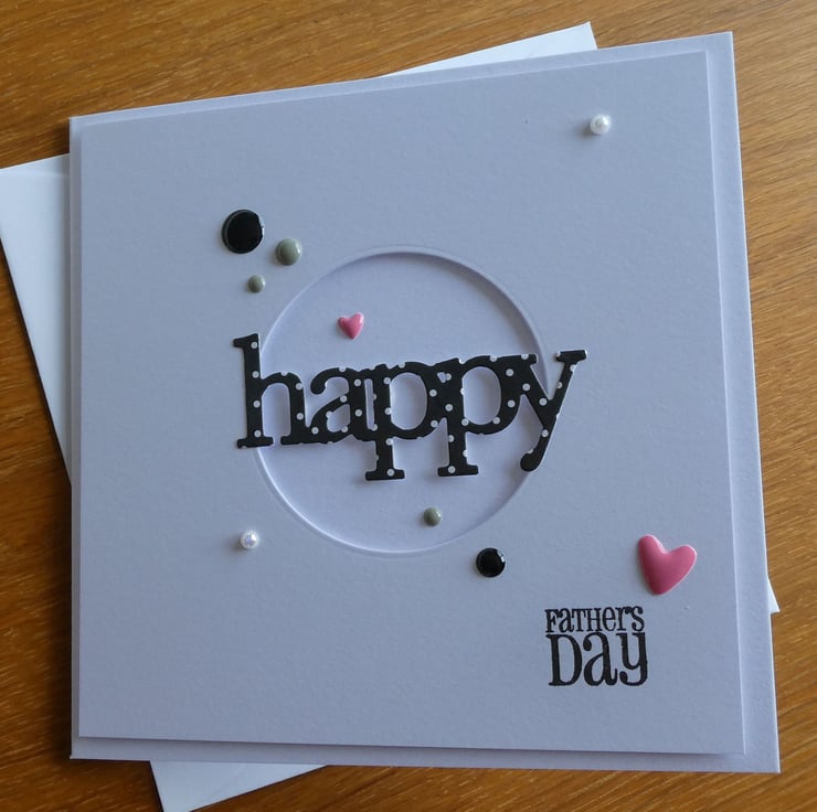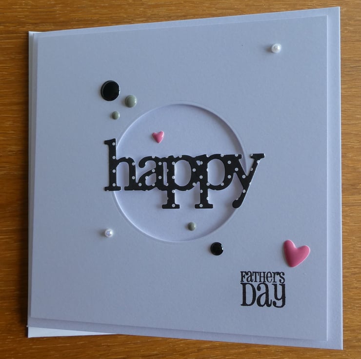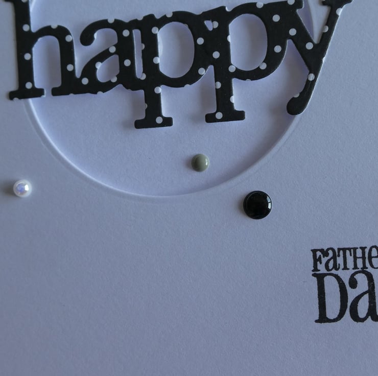 This Fathers Day card has the word Happy cut from black and white polka dot card over a circular aperture which has been die cut by hand into a square of quality white card and attached with foam pads to raise it from the card front.