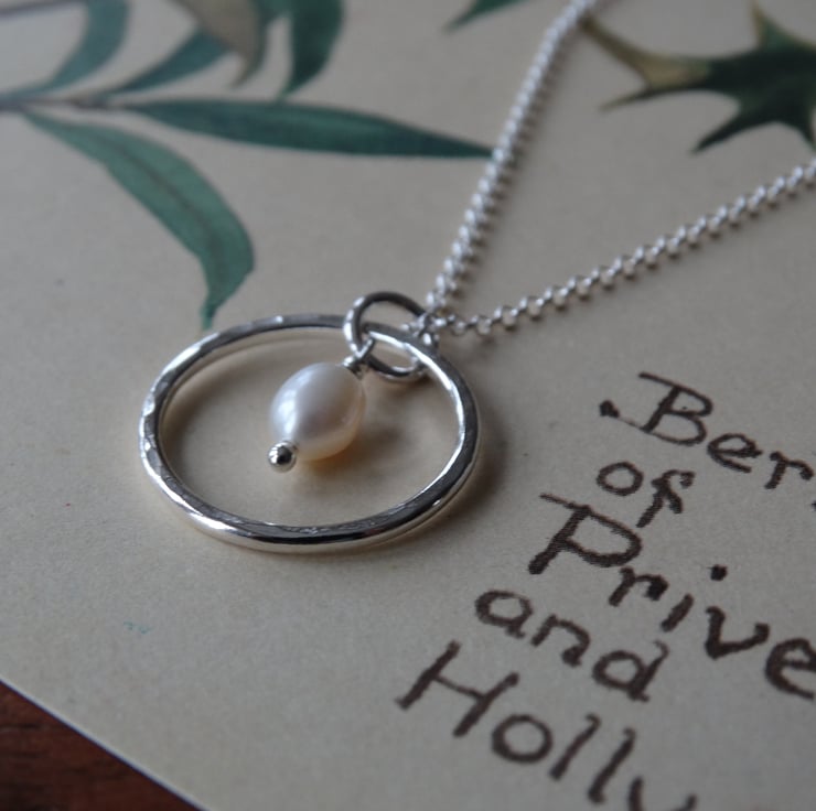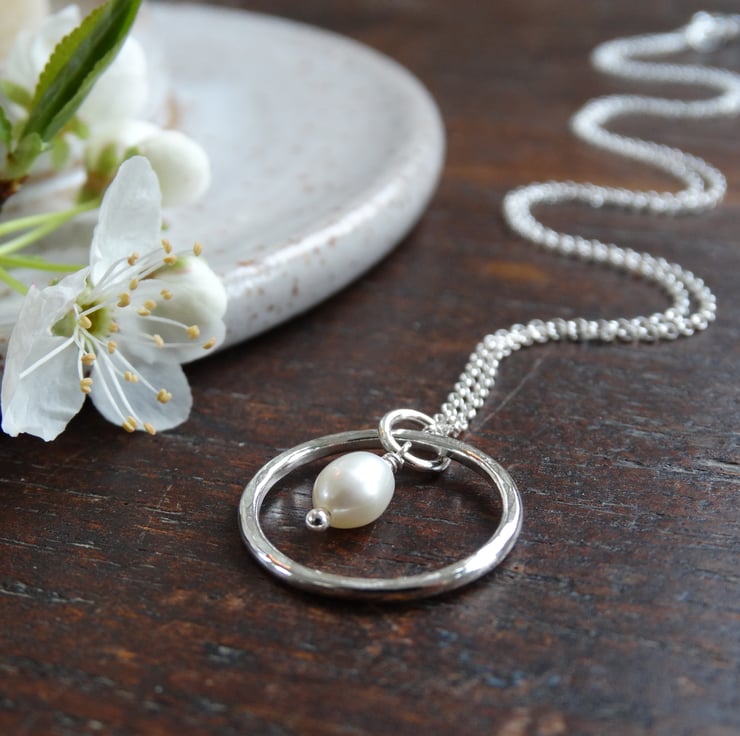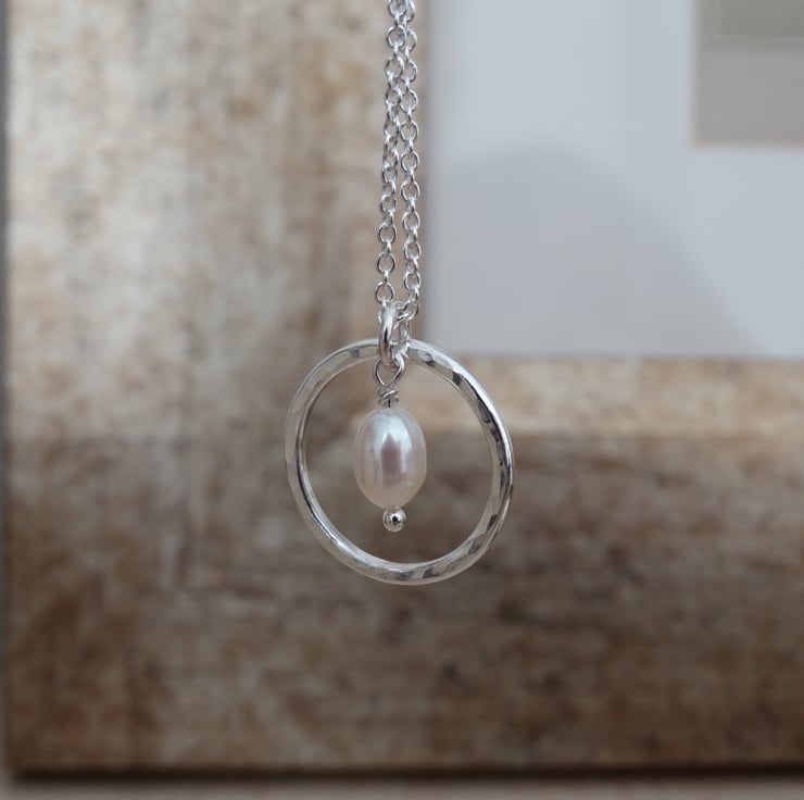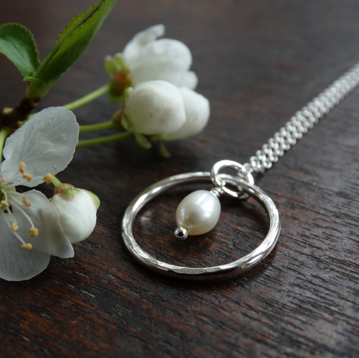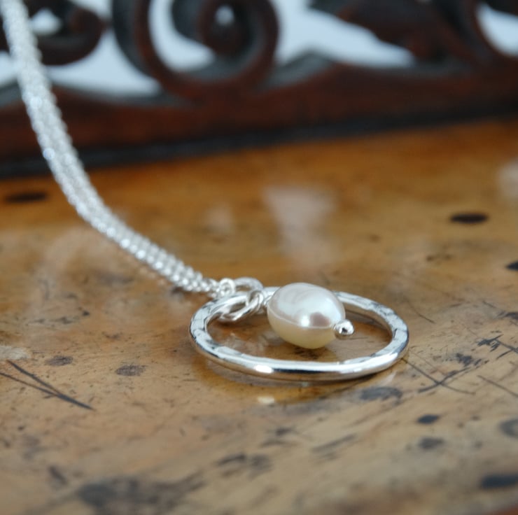 This sweet little pendant has been formed from 100% recycled sterling silver which has been formed into a hoop and hammered gently so that it catches the light. It features a lustrous freshwater pearl.