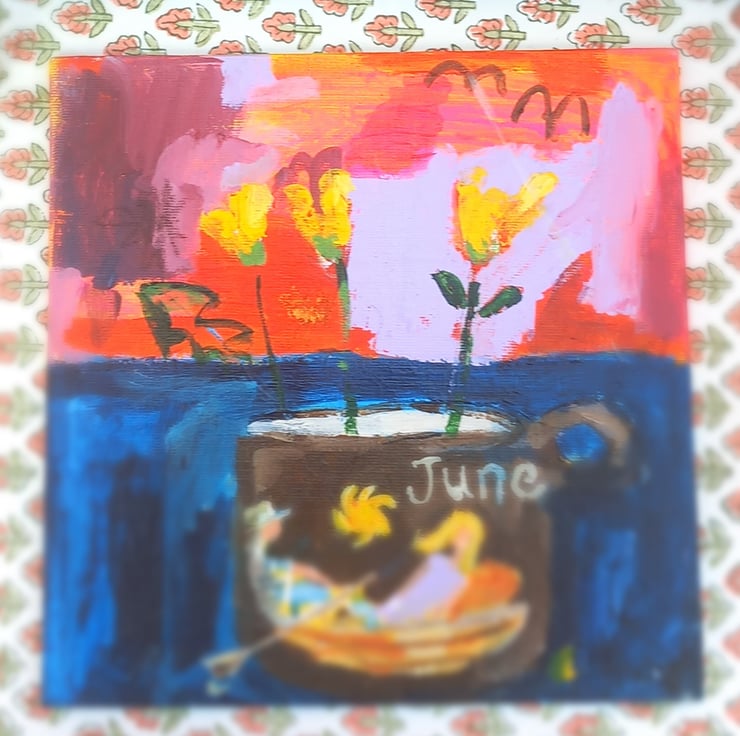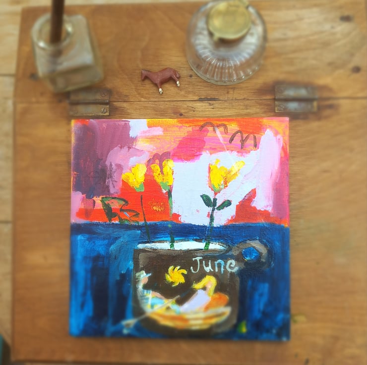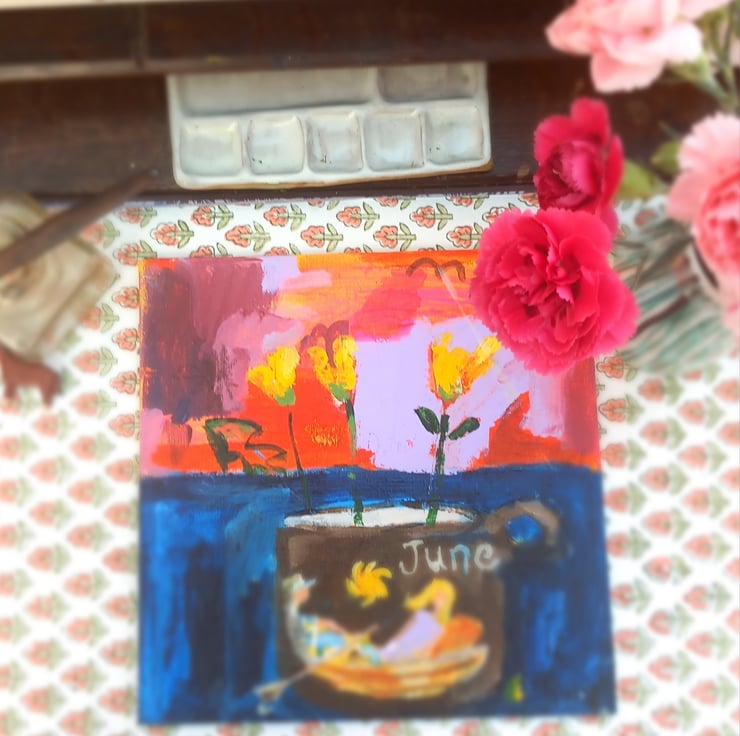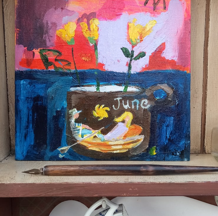 A charming naive style of a contemporary still life painting measuring apox 20.cm.square painted on winsor and newton board. Golden flowers sitting proud on the window sill . The child like birds make me smile, a simplicity to childlike summer days. Lightly varnished, arrives unframed and thoughtfuly wrapped.