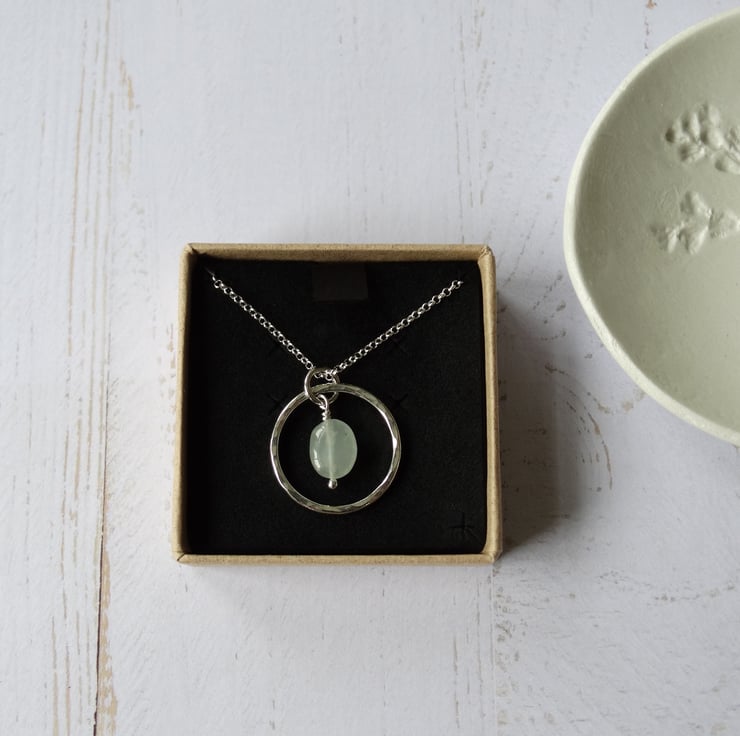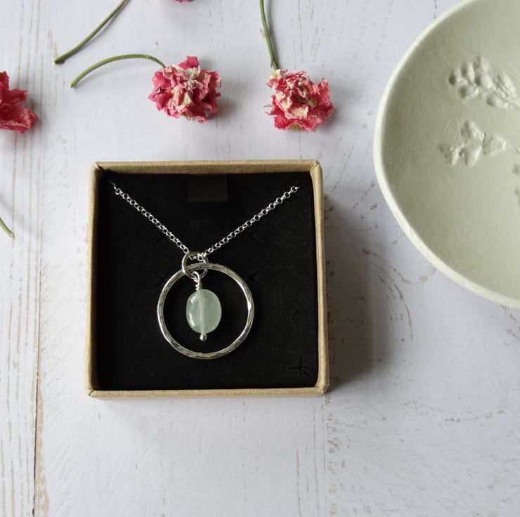Silver hoop pendant with aquamarine gemstone pebble - recycled silver