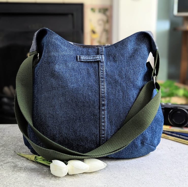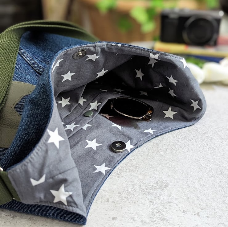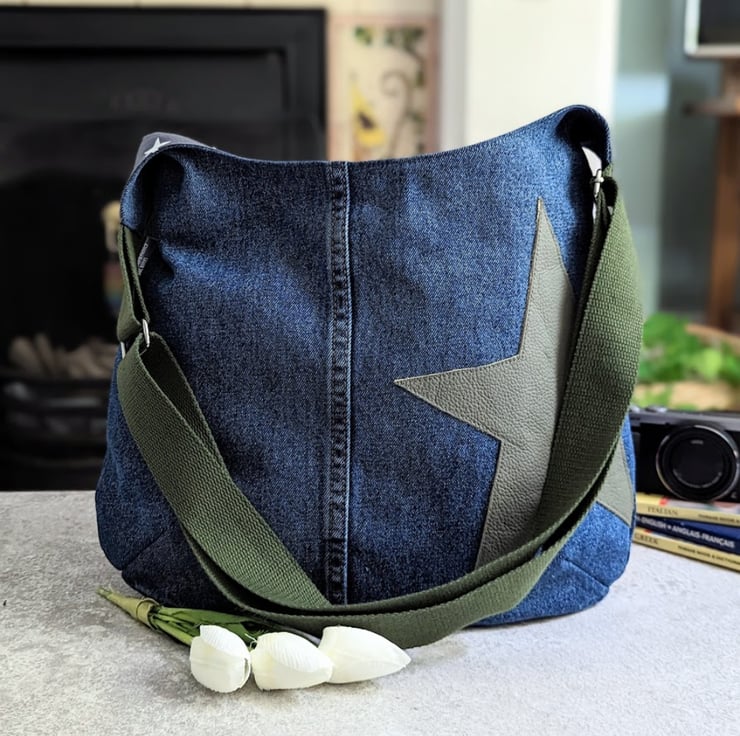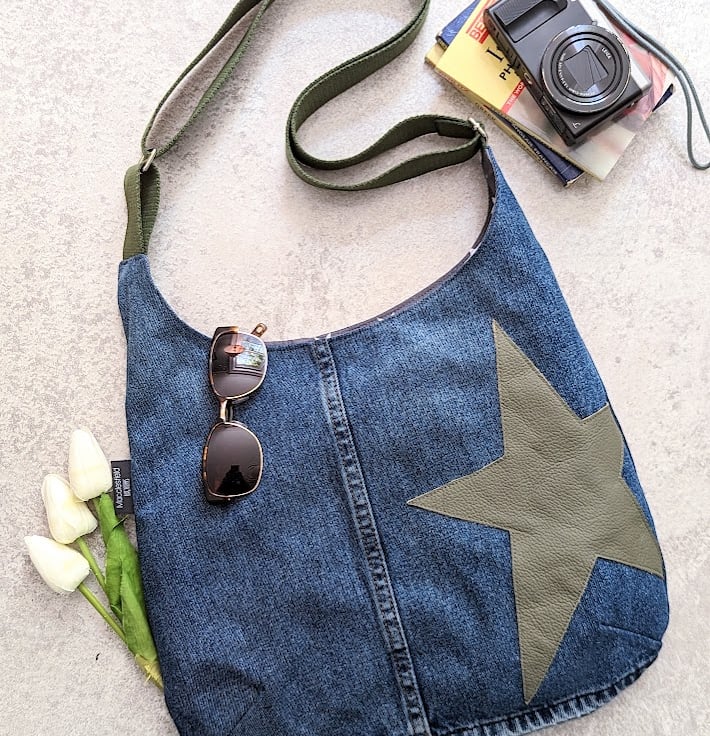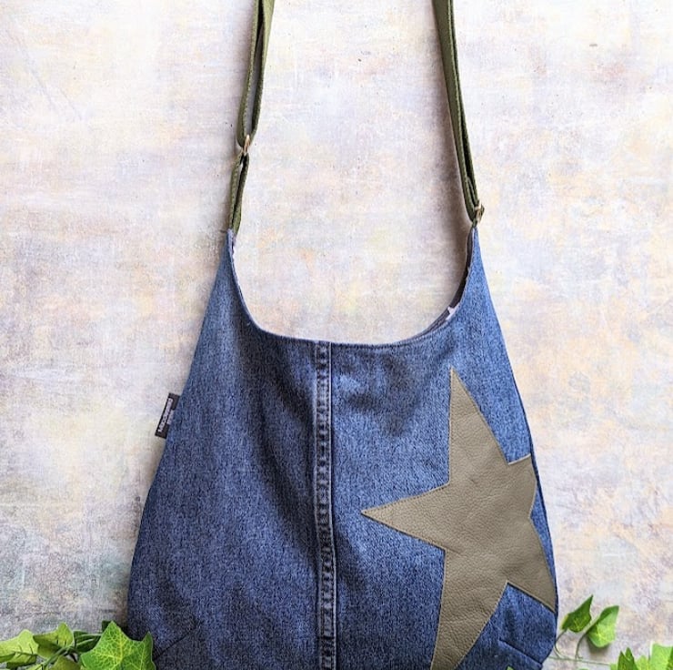 A recycled denim cross body or shoulder bag a stylish twist. Designed and handmade using preloved denim jeans and off-cut leather pieces, it's neutral tones and grey and white star print cotton lining, make it a great choice for any outfit. Dress it up or dress it down, it’s slouchy and perfect for all your everyday essentials and more!