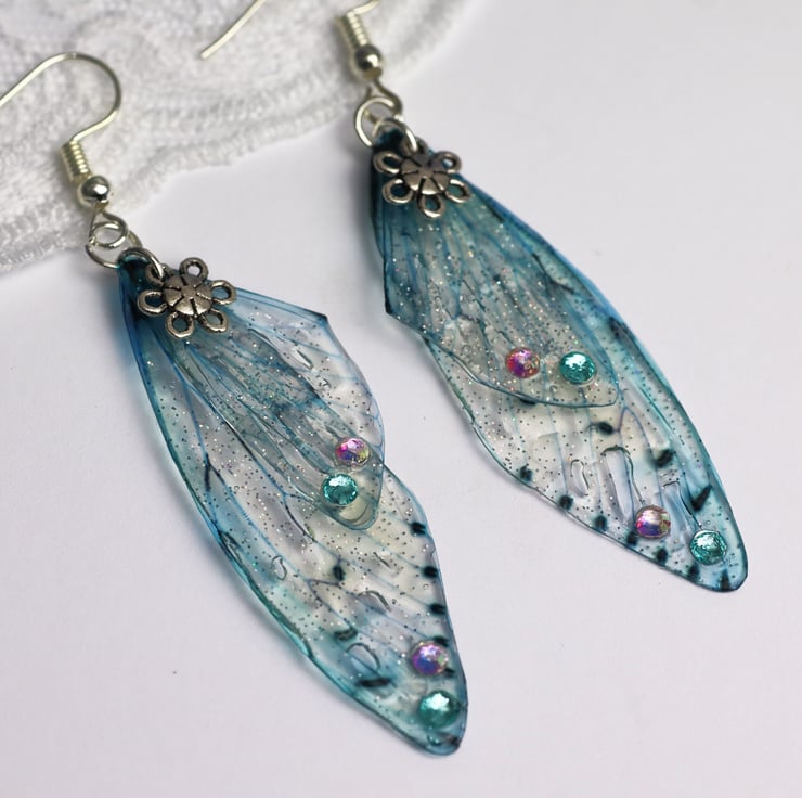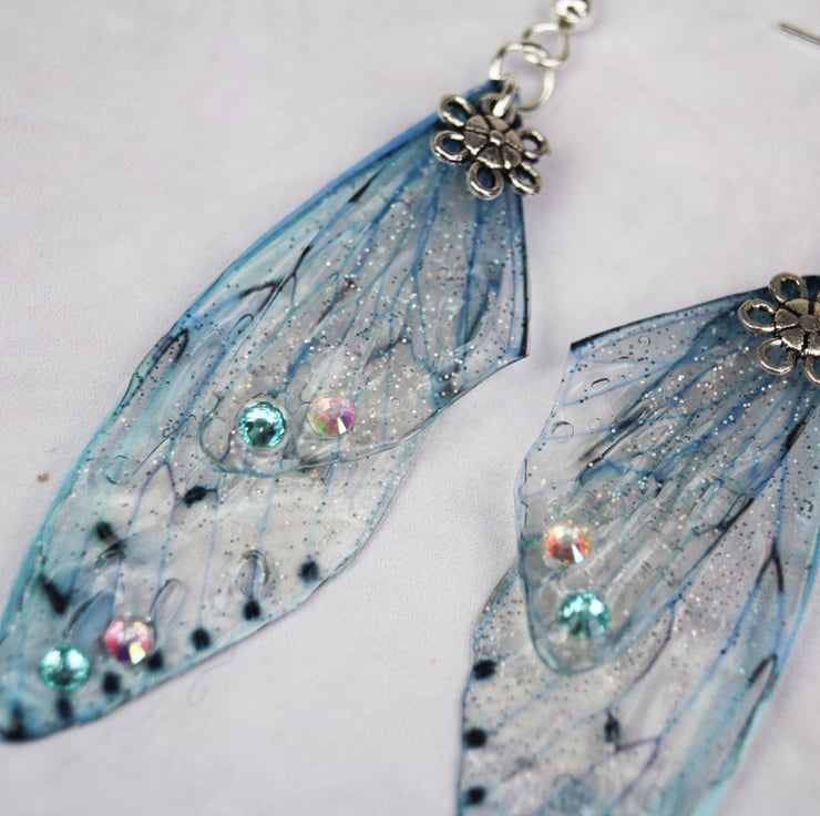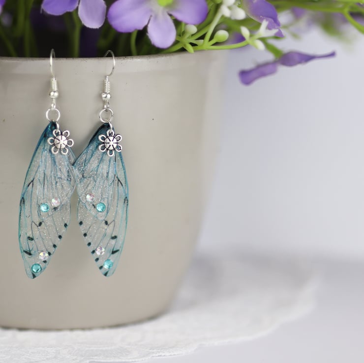 A must have for all fairies! A truly beautiful pair of icy blue transparent cicada fairy wing earrings, adorned with shimmering crystals and silver flower charm. The wings measure approximately 5cm in length.