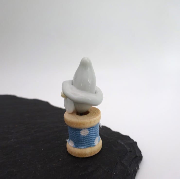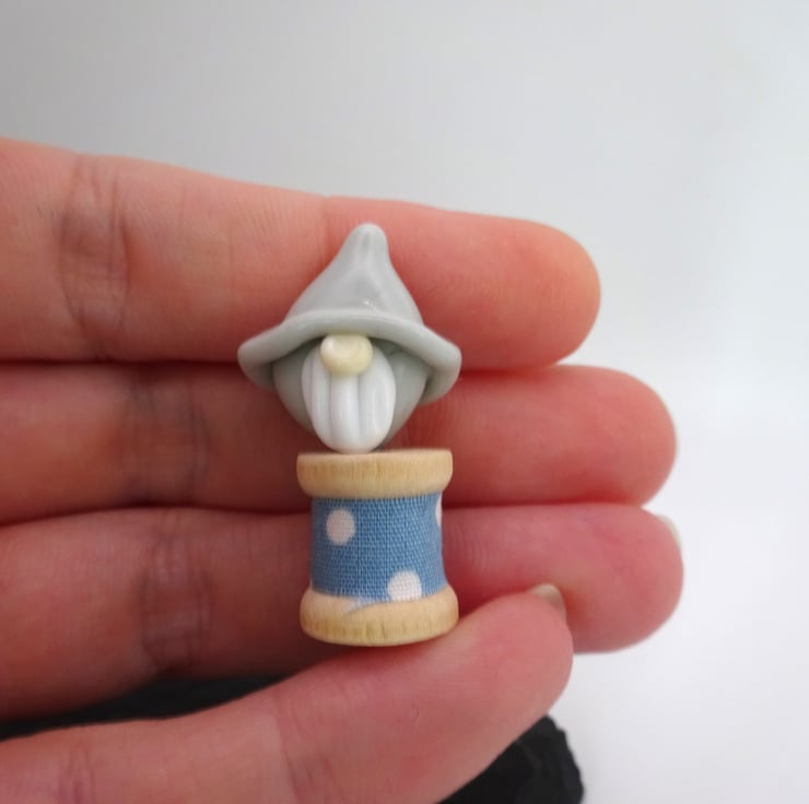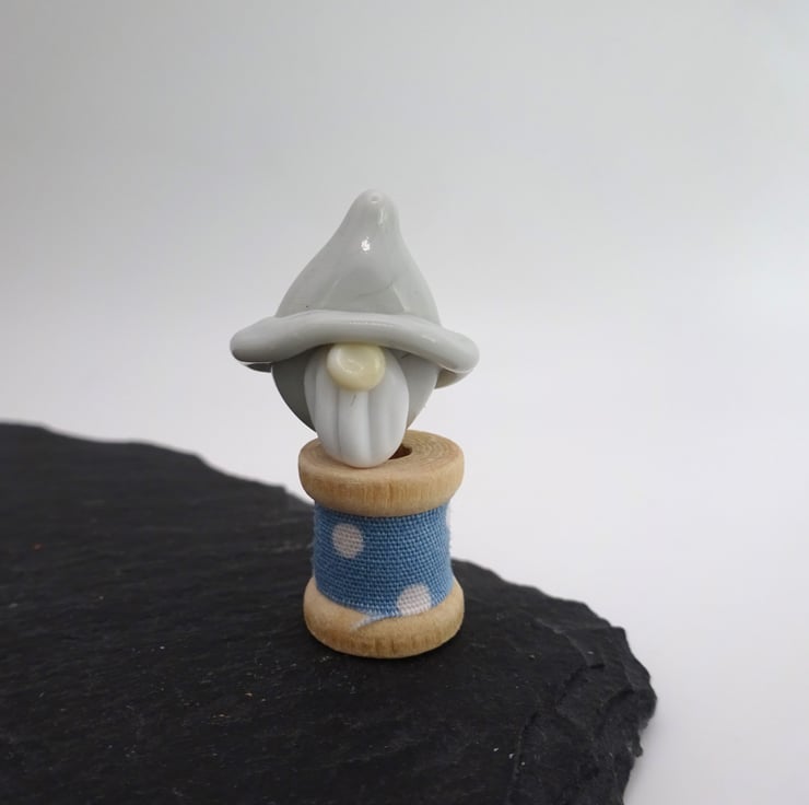 A small glass gift made with a wooden bobbin and a handmade lampwork glass gnome.