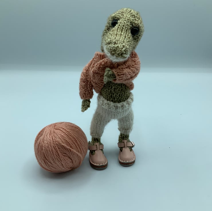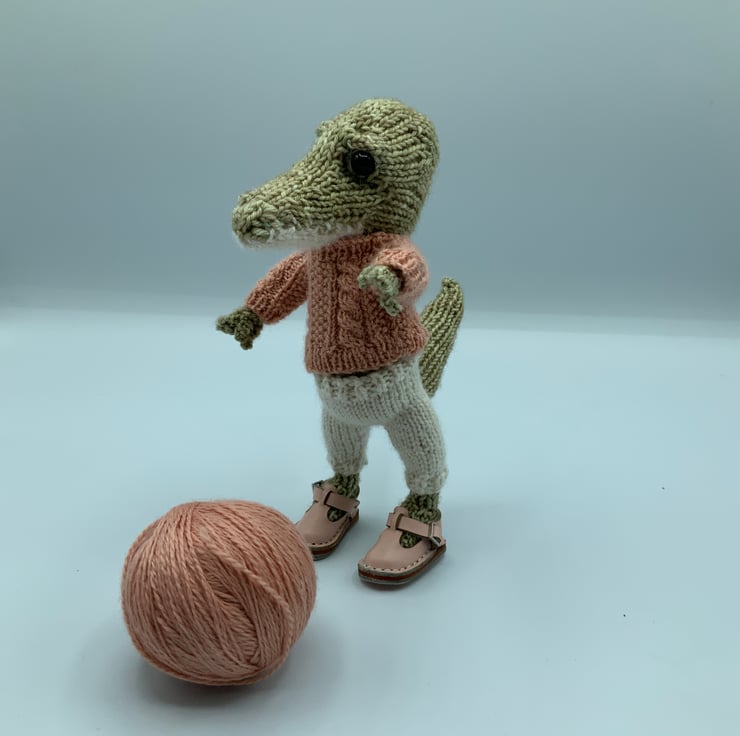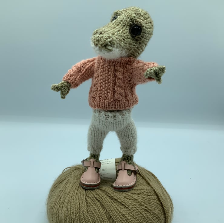 Using the original Dot Pebbles pattern, this Croc Doll has been hand knitted by use using a mixture of Merino and Alpaca yarns.
