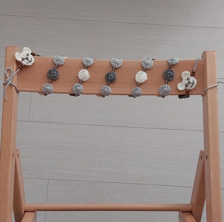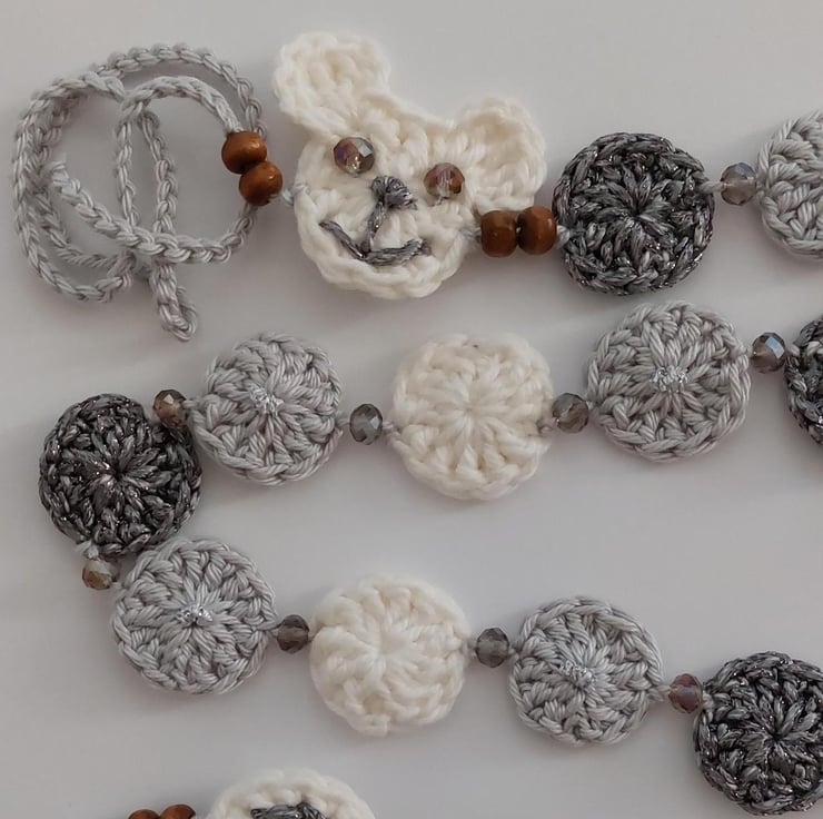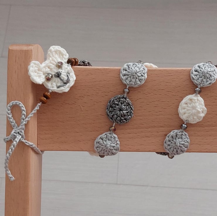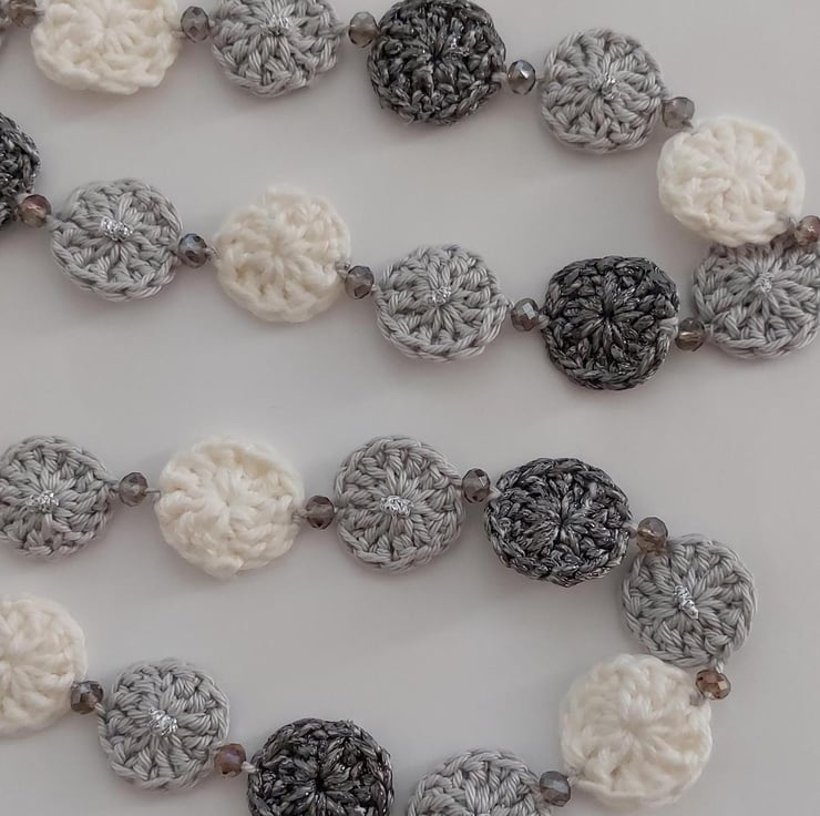 A lovely handmade crochet garland, in between the circles I added grey glass beads to add a little sparkle