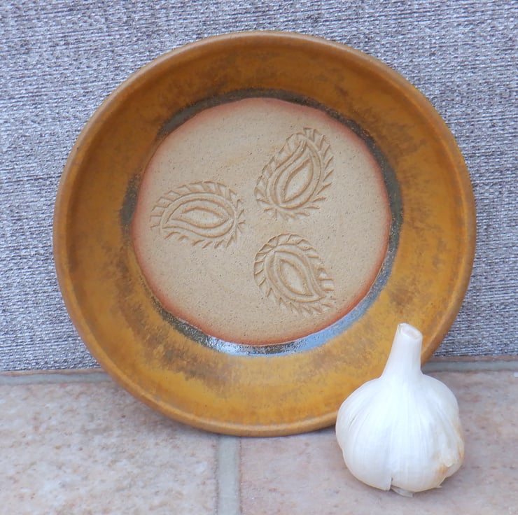 Just peel a clove of fresh garlic and grate across the raised edges of the unglazed area in the middle of the dish. The unglazed area creates the sharp grating place to shred your garlic. Add olive oil, salt and pepper to taste and begin dipping your bread.