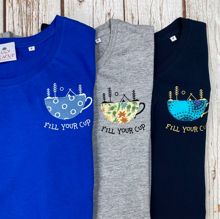 Introducing our lovely "Fill Your Cup" T-Shirt, thoughtfully crafted using premium organic cotton in a charming Heather Grey shade. This delightful piece features a captivating design with retro floral fabric appliqués, beautifully complemented by intricate black flock details.