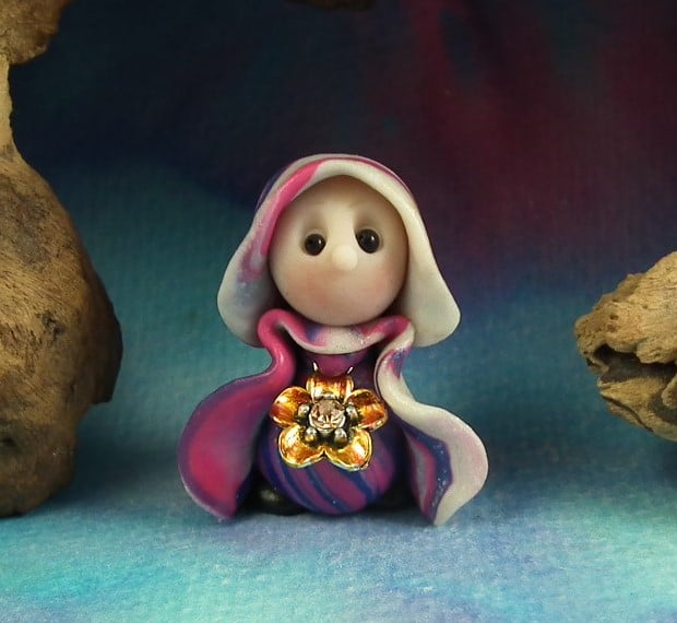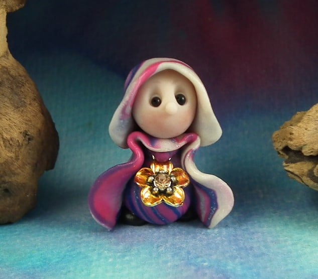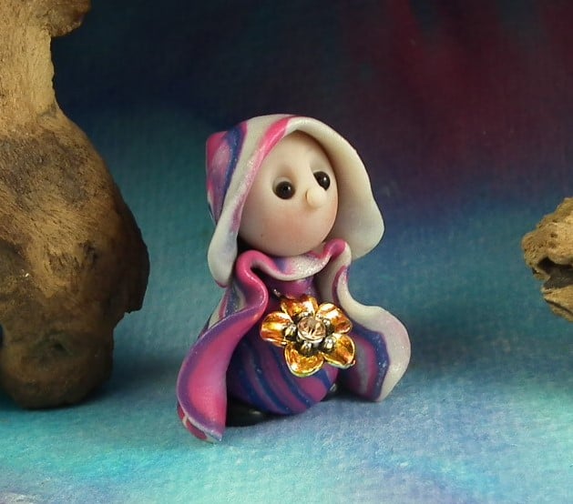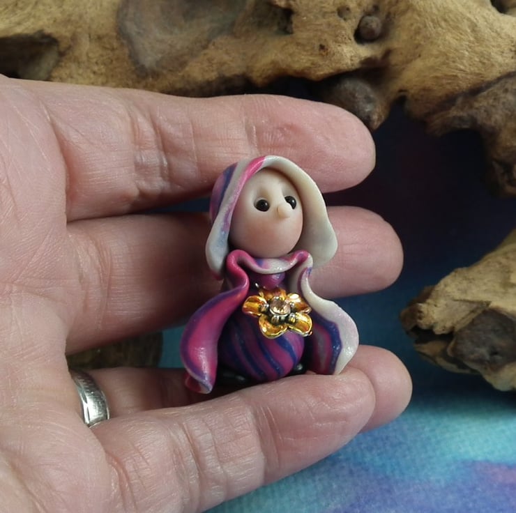 This is a 'one of a kind' creation having been entirely handmade without the use of moulds here at my studio on the Sussex Coast. Modelled with artist blend polymers, blushed before sealing with lacquer, Lissie has sparkling black onyx eyes and variegated robes. Lissie the Floral Gnome is just one and a half inches tall.