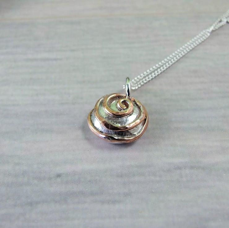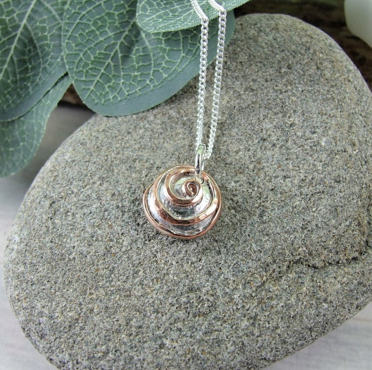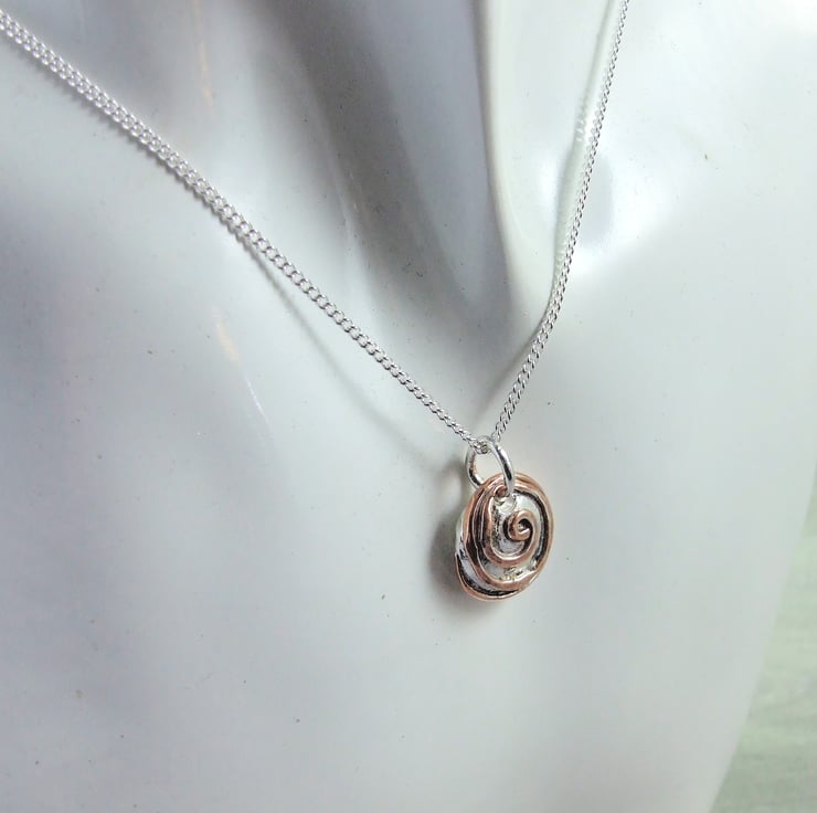 Recycled Silver Necklace. Solid Silver Nugget Pendant with copper wire spiral pattern. Handcrafted from Recycled Silver and copper wire on an 18 inch Sterling Silver Chain.