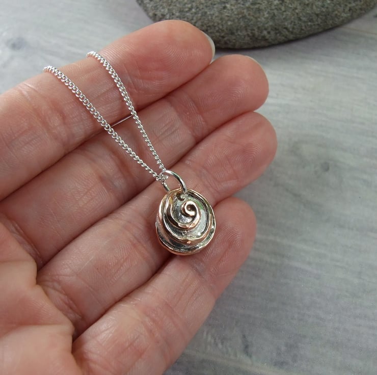 I have created the nugget from molten recycled silver that has been heated until it forms a bead and left to cool. Once cooled and cleaned I have added a hand coiled spiral made from copper wire soldered into place fitted to an 18 Sterling Silver chain. The nugget is solid silver and has a lovely weight to it and is very tactile.