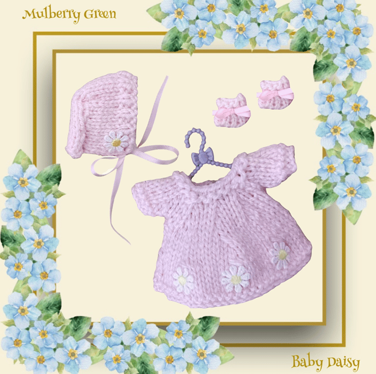A pretty little pink dress to fit baby Daisy. The dress is hand-knitted and is decorated with three little daisies. It fastens at the back with a little popper