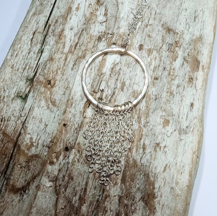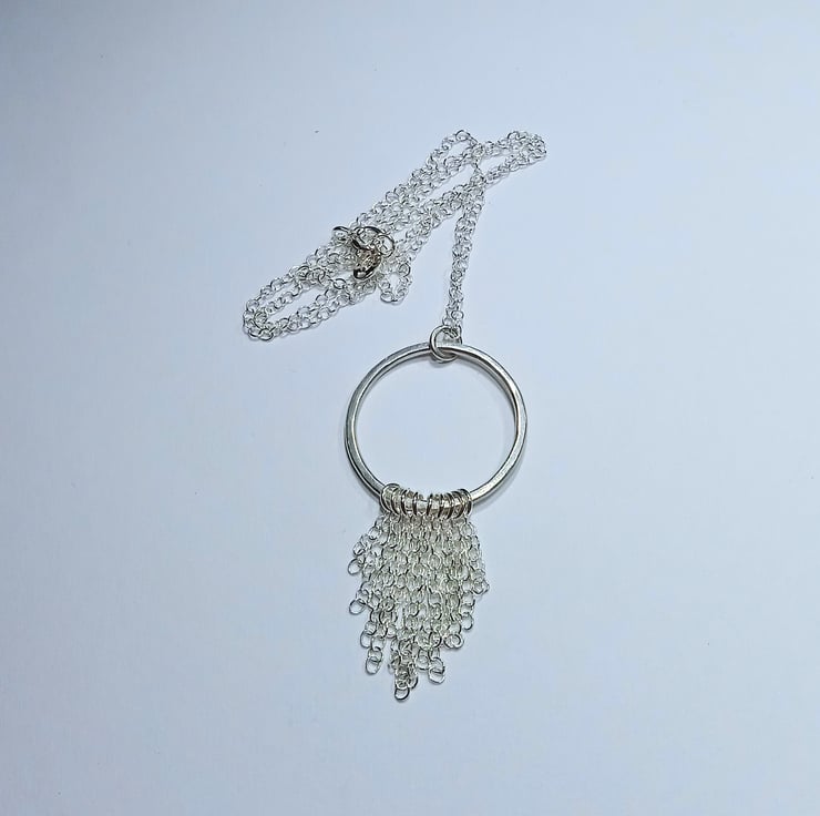 I have created the hoop from 1.5 mm sterling silver which I have soldered and hammered to create an attractive surface texture. From the hoop I have hung sterling silver chain in graduated lengths to create an elegant cascade effect. The hoop measures approximately 24.7 mm across and the pendant measures approximately 5 cm in length..
