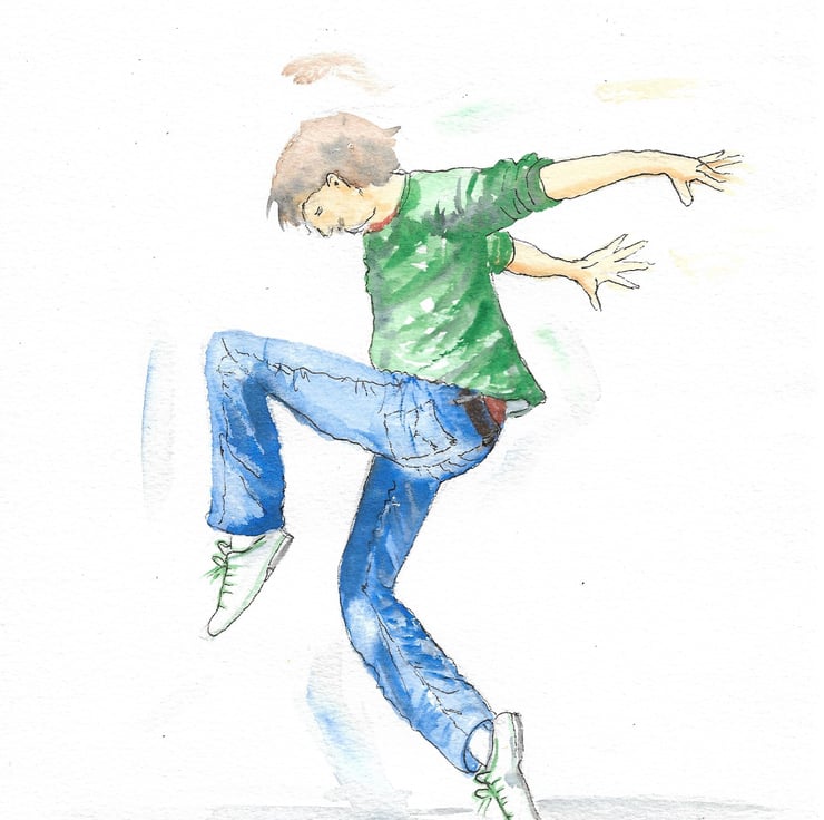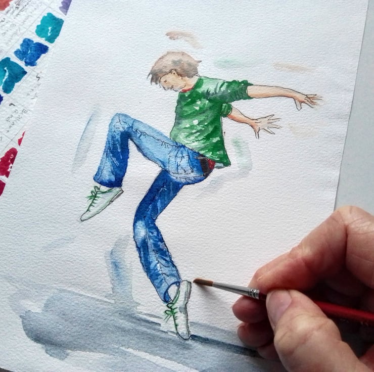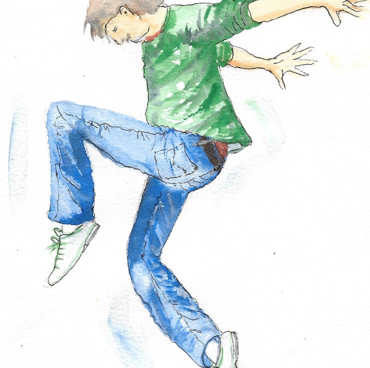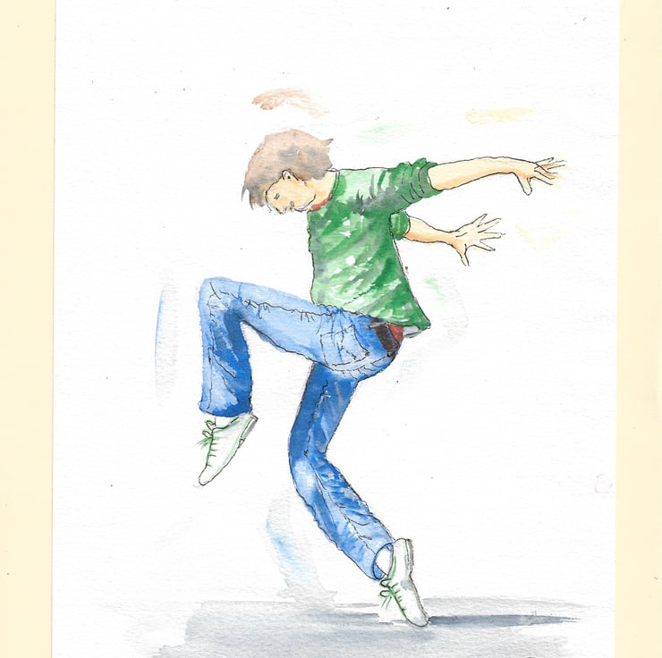 A original watercolour painting by marjansart of a happy boy doing a little dance.