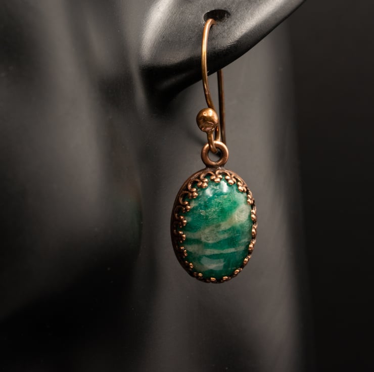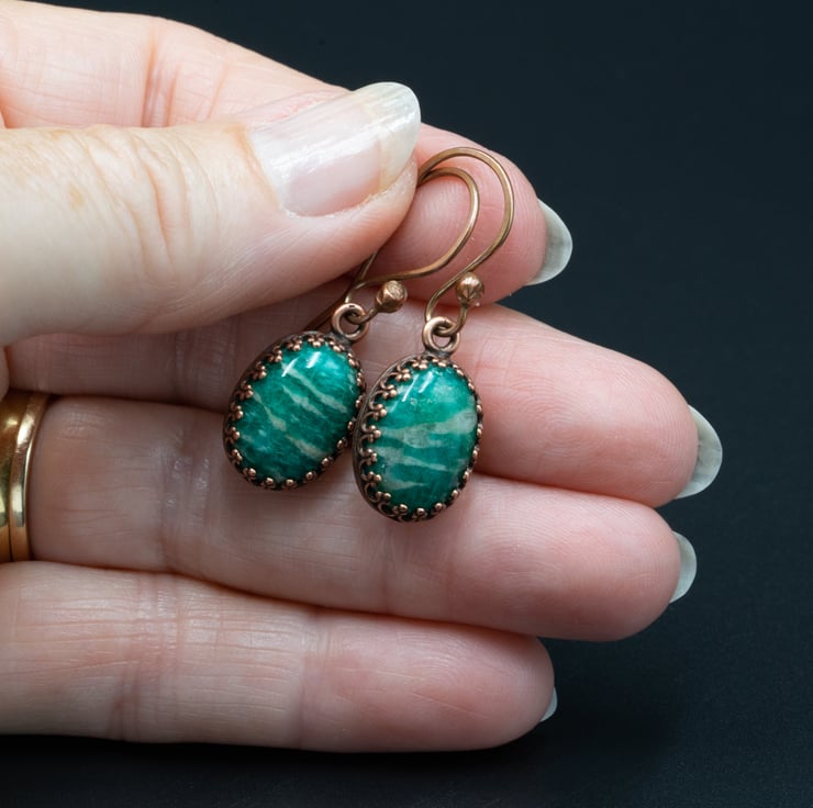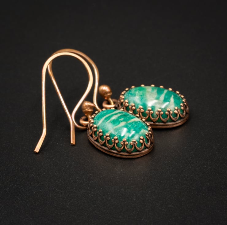 These striking deep aqua amazonite 10 x 14mm cabochon stones are mounted into a copper plated crown design setting with an open back. A great combination of casual colours.
