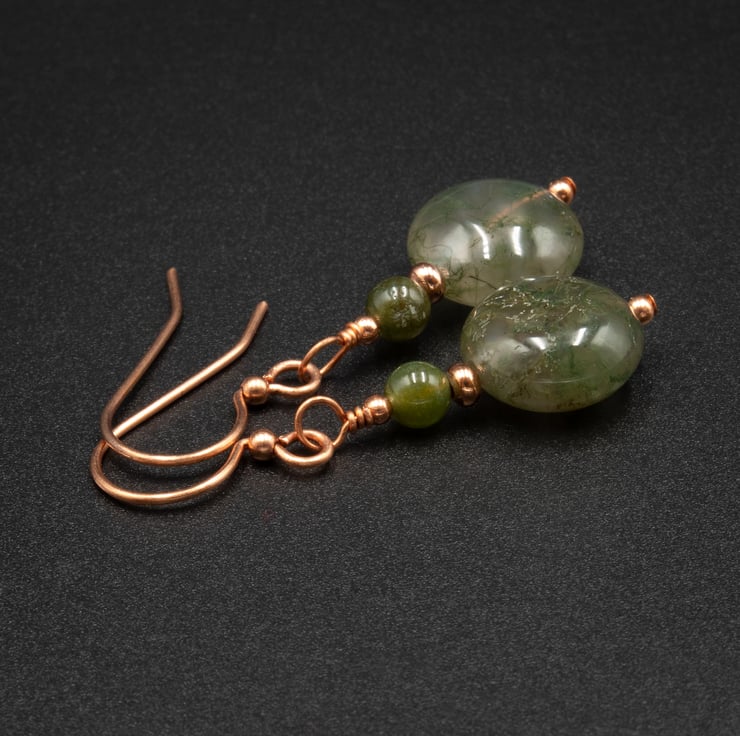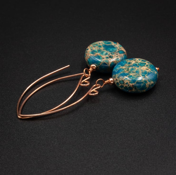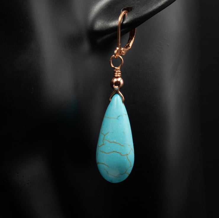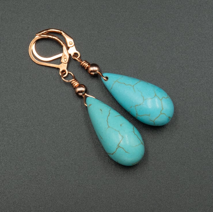 12x25mm long turquoise teardrops are accented with small copper beads. The drops hang from a pair of pure copper leverback ear wires, very comfortable to wear and secure.