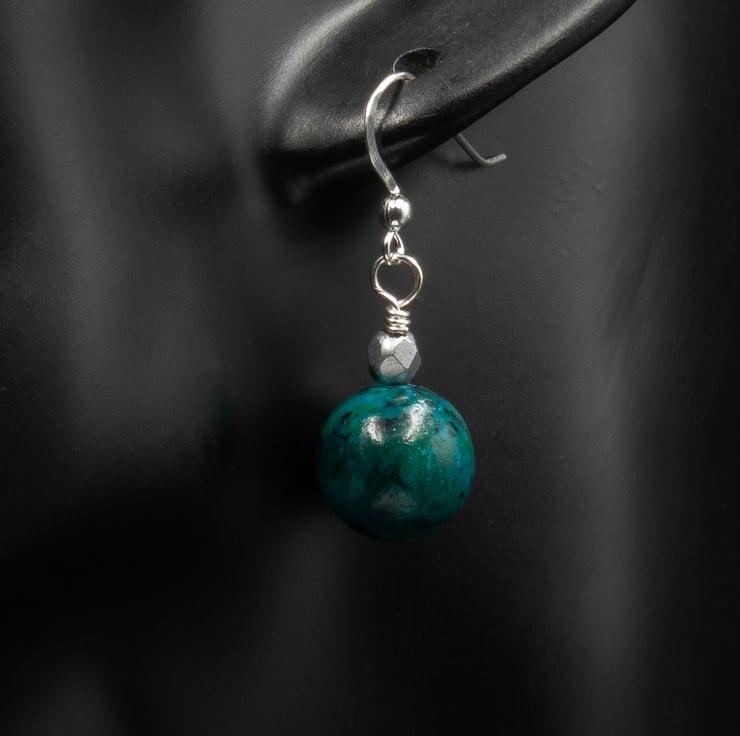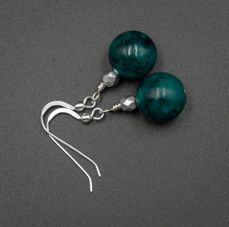 Smooth 12mm rounds of blue green chrysocolla are topped with a faceted matt silver glass bead.