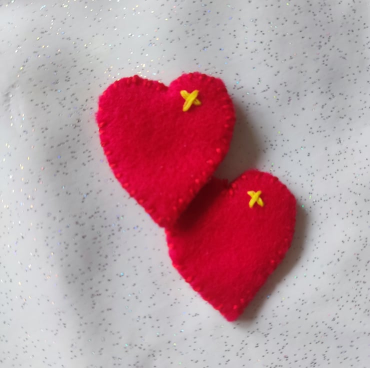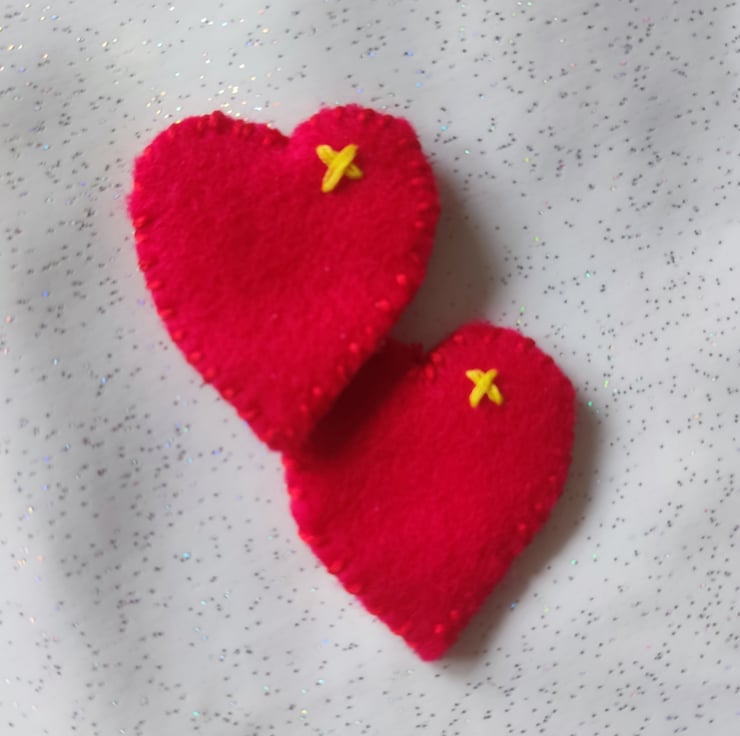 These are a bright red and stitched by hand with a little sunshine yellow kiss on each