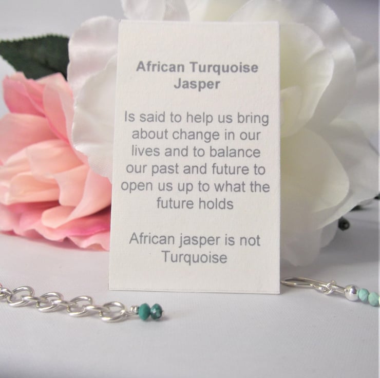 African turquoise jasper is known for its ability to help with change, and balance our past with our future.