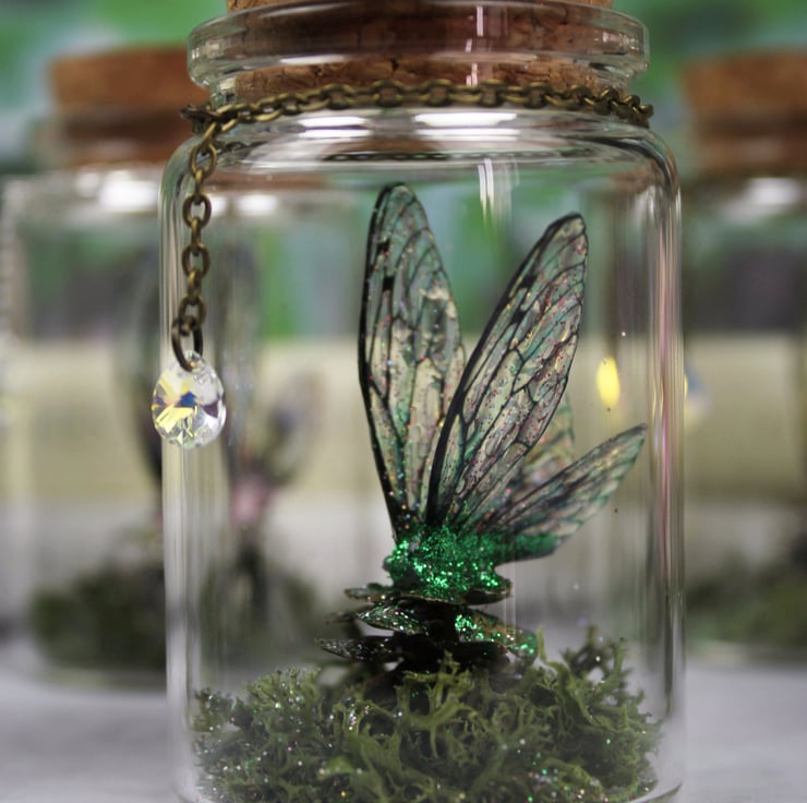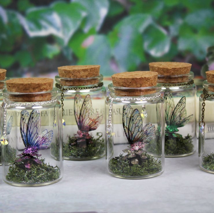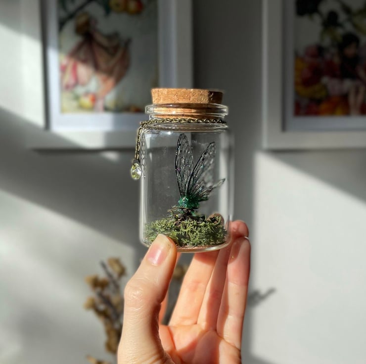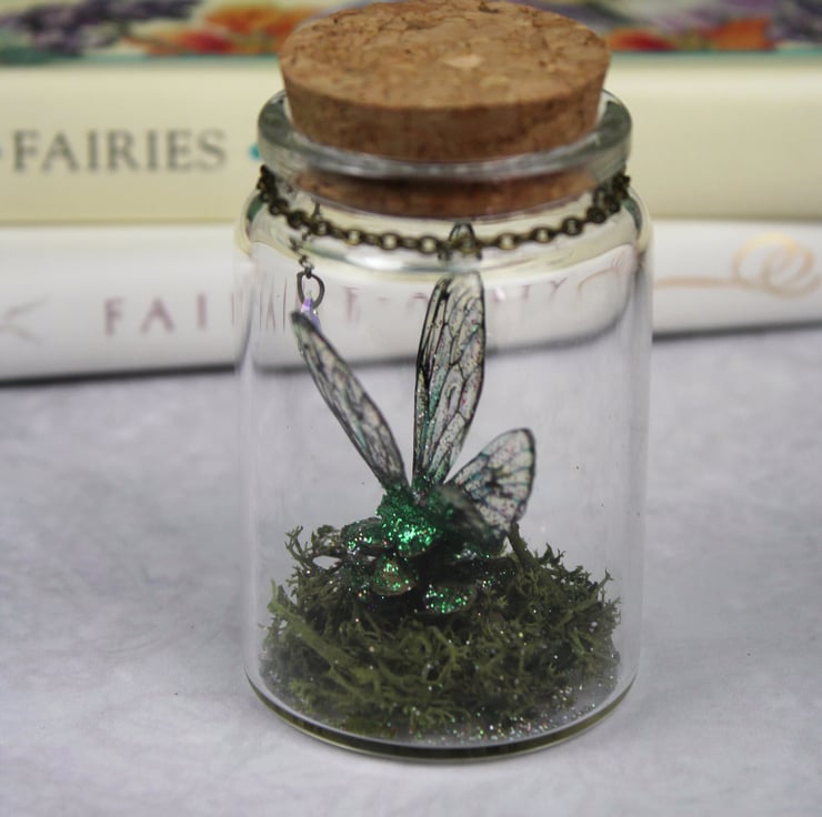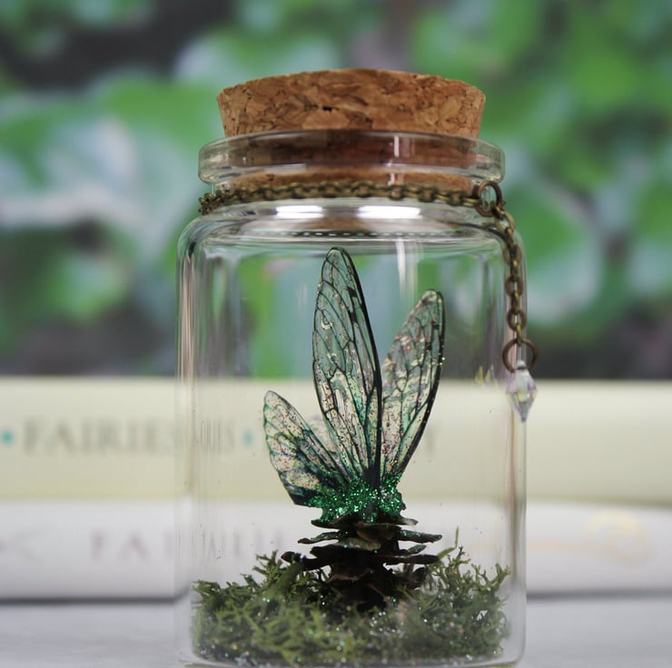 A must-have for all fairies! This is a unique and truly magical little fairy jar, containing green moss, glittered pinecone and a set of my handmade deep green fairy wings. This beautiful little jar would make a wonderful home ornament, as well as the perfect gift for a loved one! The jar is glass, with a cork lid. It measures approximately 70mm by 47mm. A genuine Swarovski droplet gem hangs from a bronze chain.
