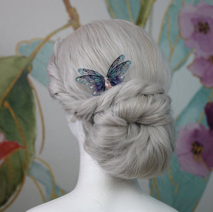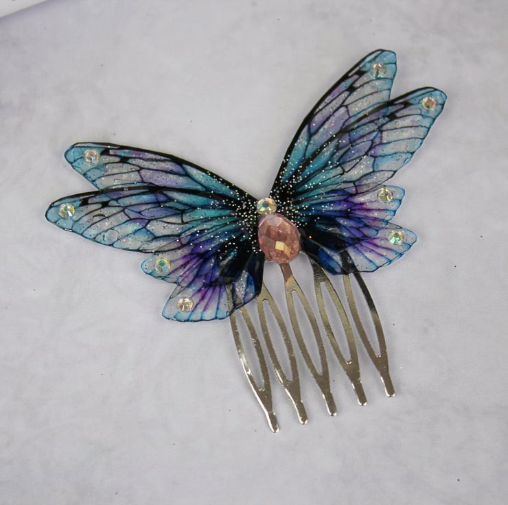 A must have for all fairies! A truly beautiful mini Victorianvintage style blue and pink fairy wing hair comb, adorned with shimmering crystals. The wings measure approximately 9cm across.