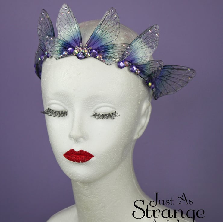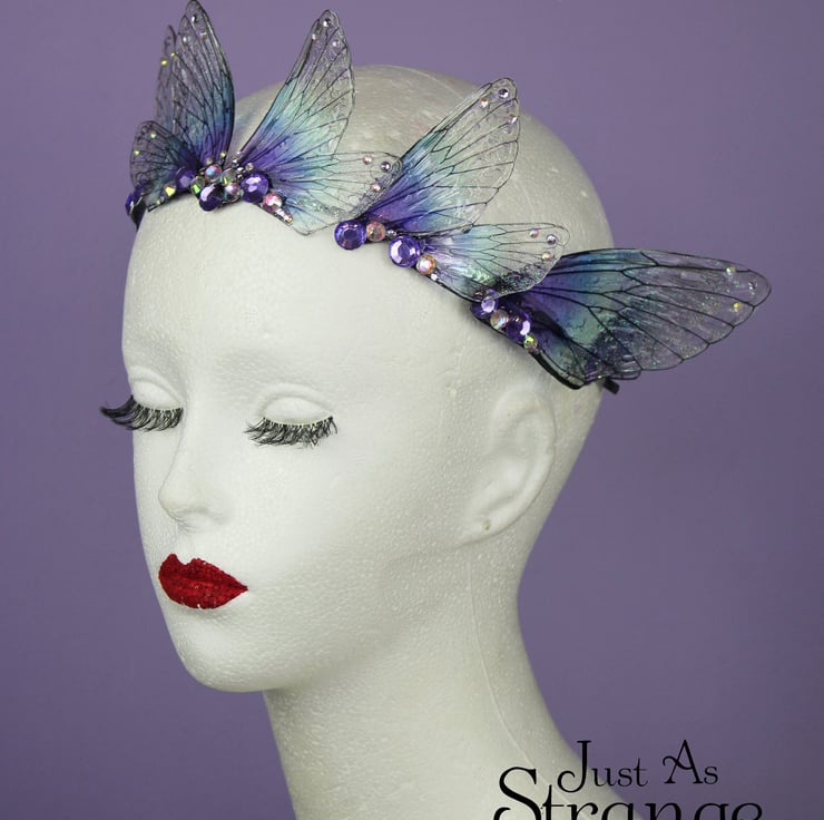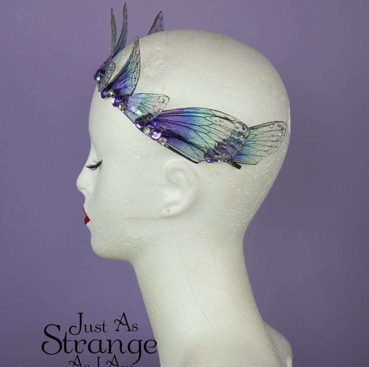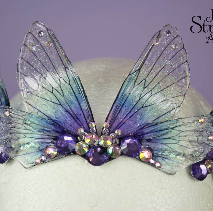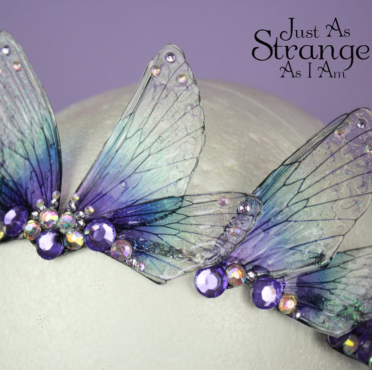A beautiful tiara, fit for any fairy bride! These wings are a transparent purple and blue, reminding me of a midnight sea. The fairy wings are attached a metal silver band, and adorned with gems and beads. This tiara is light weight, sturdy and one size should fit all. Due to its delicate parts, I would say it is unsuitable for children.