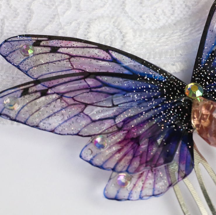 A must have for all fairies! A truly beautiful mini Victorianvintage style purple and pink fairy wing hair comb, adorned with shimmering crystals. The wings measure approximately 9cm across.