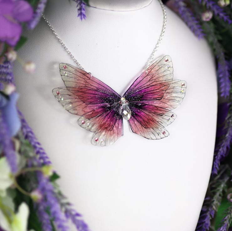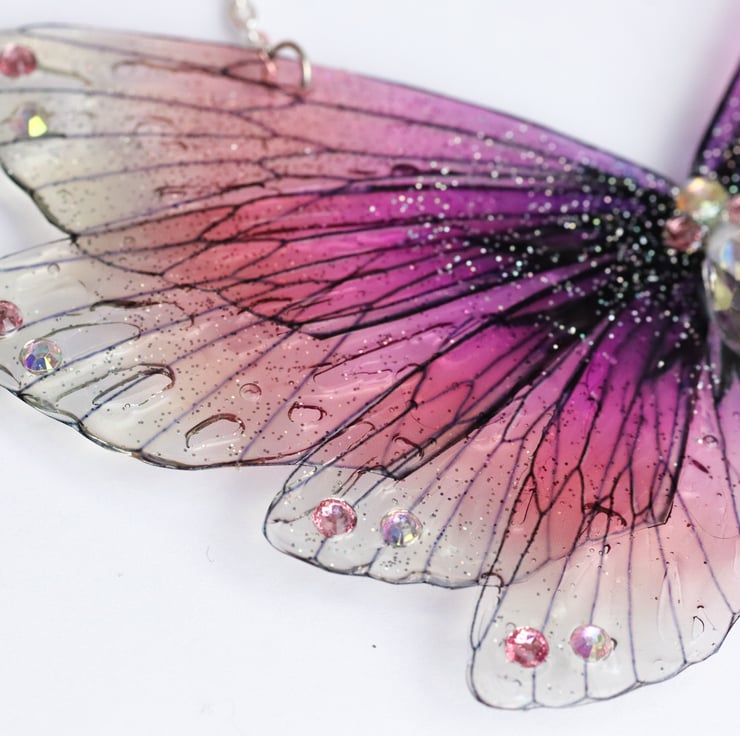 A must have for all fairies! A truly beautiful deep pink and purple necklace, made out of enchanting fairy wings. The necklace is embellished with beads, silver gems and a dash of silver glitter. The pendant measures approximately 11cm across.