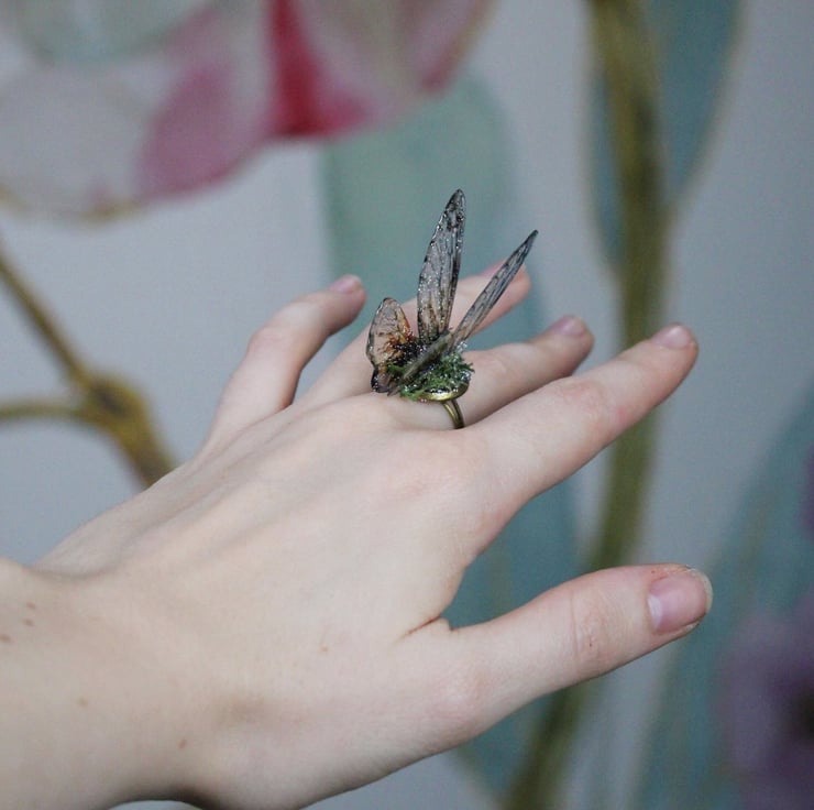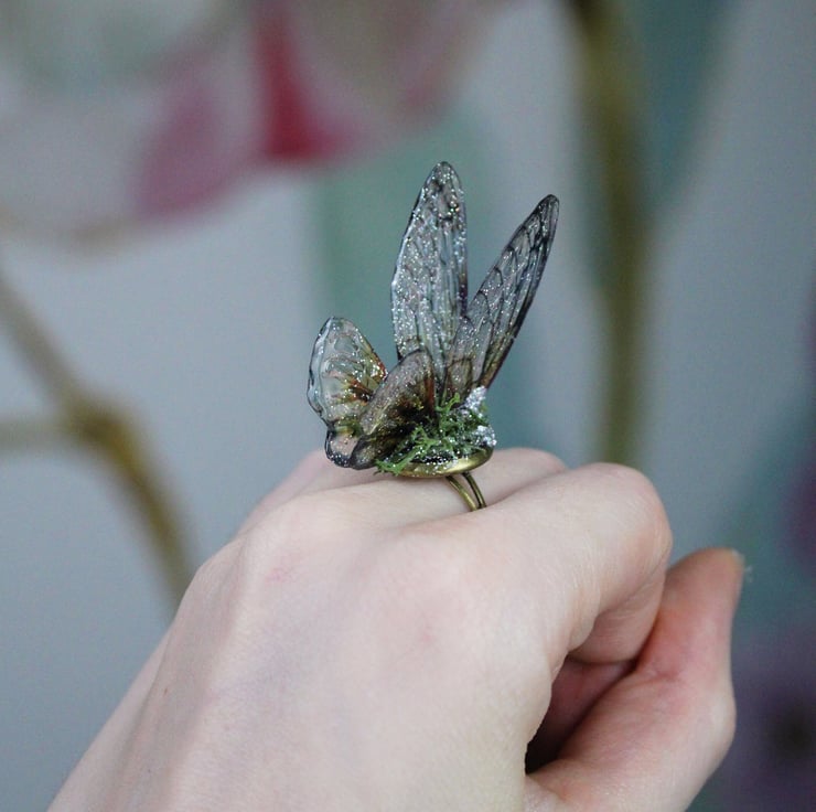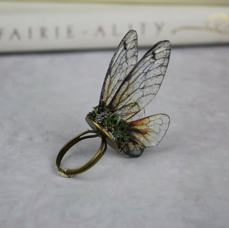 A must have for all fairies! A truly beautiful transparent natural coloured fairy wing ring, adorned with a dash of silver fairy dust and green foliage. The ring is bronze in colour, and easily adjustable - one size ought to fit all!