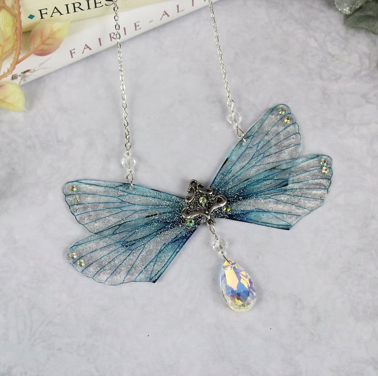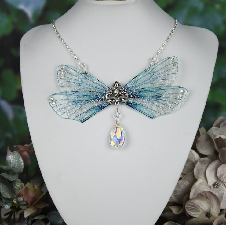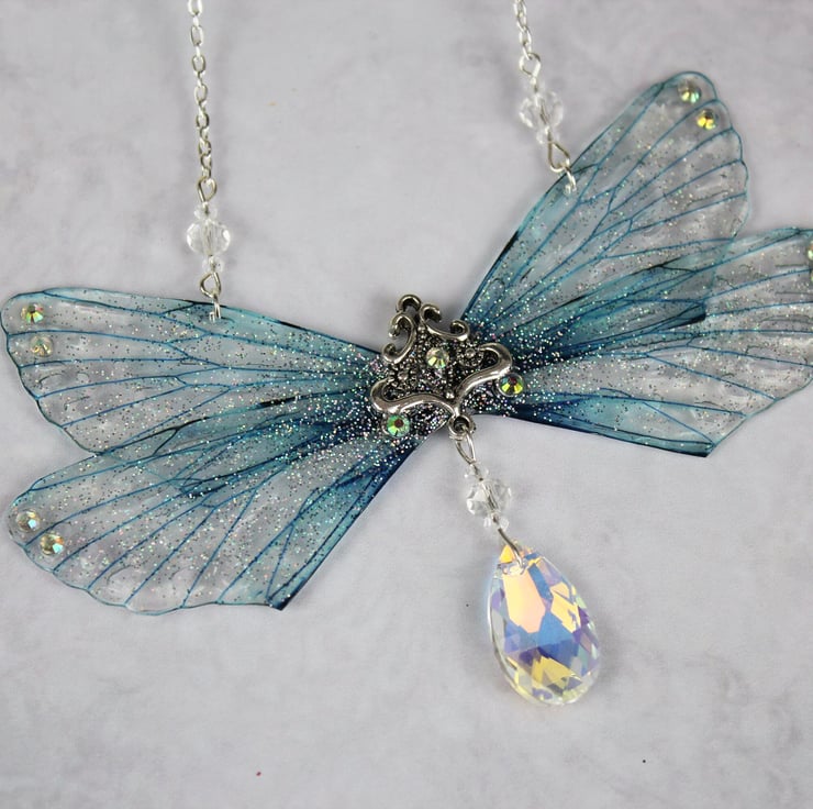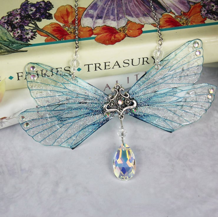 A must-have for all fairies! A unique and truly beautiful icy blue sparkle fairy wing cicada pendant. This necklace is embellished with silver sparkle, gems and large Swarovski bead. The wings measure approximately 12cm across.