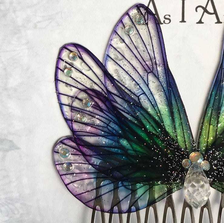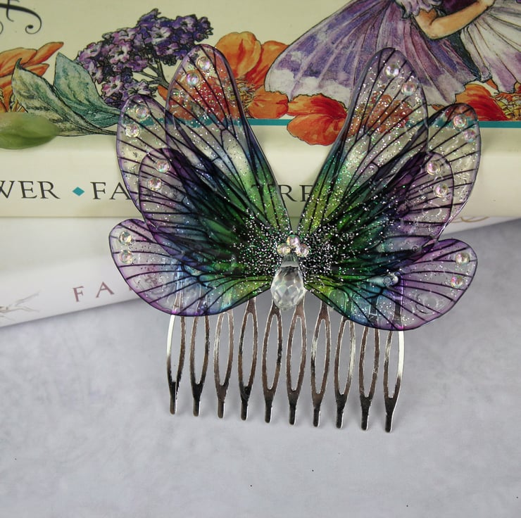 A must-have for all fairies! A truly beautiful Victorianvintage style purple and green fairy wing hair comb, adorned with shimmering crystals. This enchanting comb reminds me of mermaid scales and sea spray! The wings measure approximately 9cm wide.