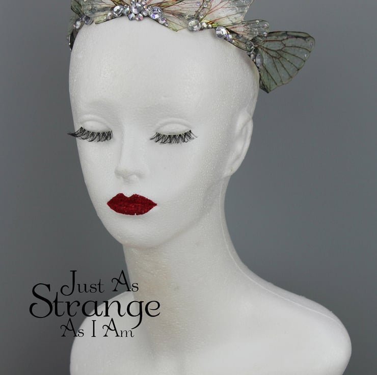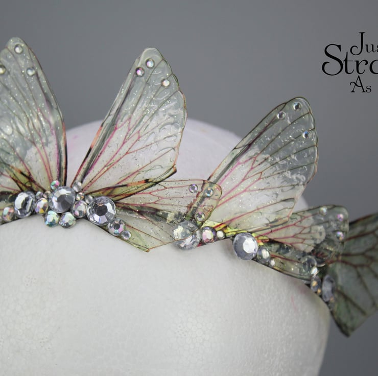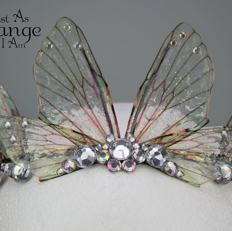 A beautiful tiara, fit for any fairy bride! These wings are a delicate, natural looking yellow. The fairy wings are attached a metal silver band, and adorned with clear coloured gems and beads. This tiara is light weight, sturdy and one size should fit all. Due to its delicate parts, I would say it is unsuitable for children.