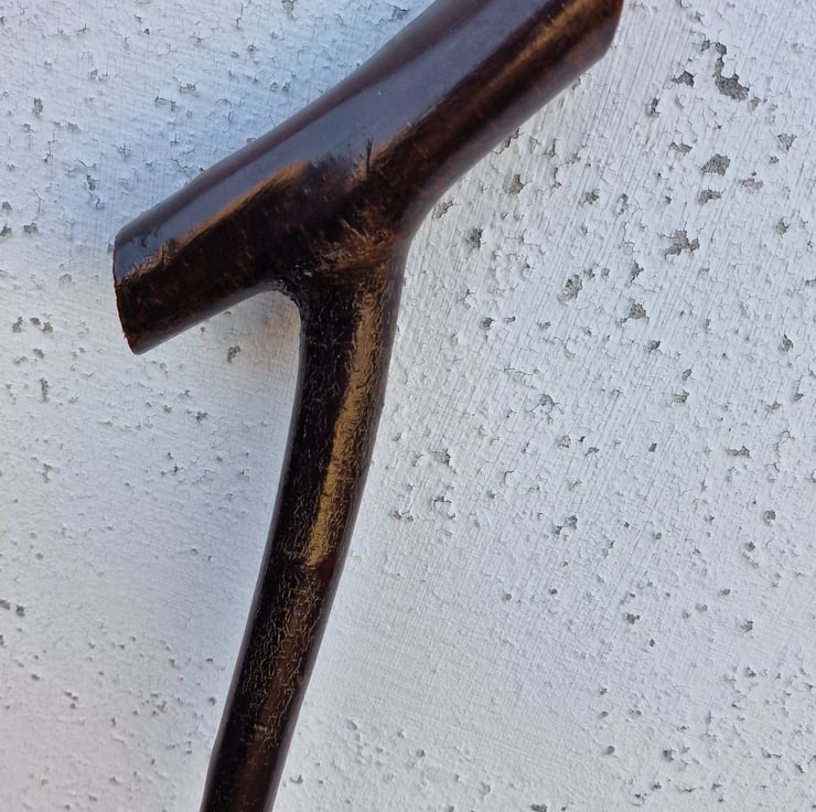 Blackthorn natural walking stick, Beautifully hand crafted and hand finished. As good as Mother Nature gets, harvested straight from the parent tree where it was naturally formed to a perfect walking stick. Many hours spent hand finishing to reveal the natural beauty and colour of the Blackthorn, finished with two coats of clear, mat sheen varnish. Most suited to a smaller hand.