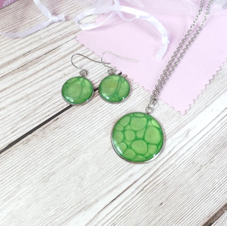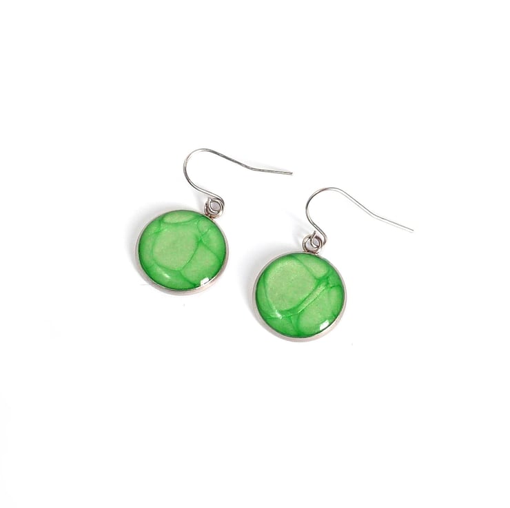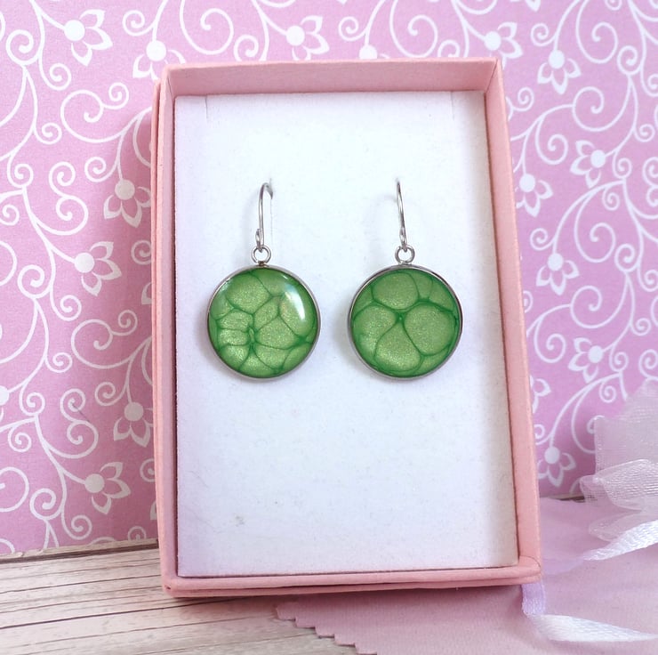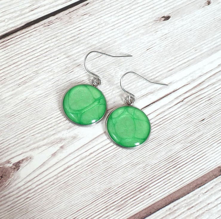 Bright emerald green earrings made from round steel bezels filled with a gold-shimmering metallic green enamel and crystal clear resin to enhance the colour. The wires are also made from stainless steel. The earrings are also lightweight and very comfortable to wear.