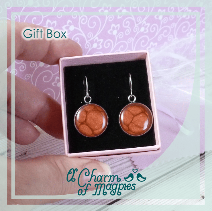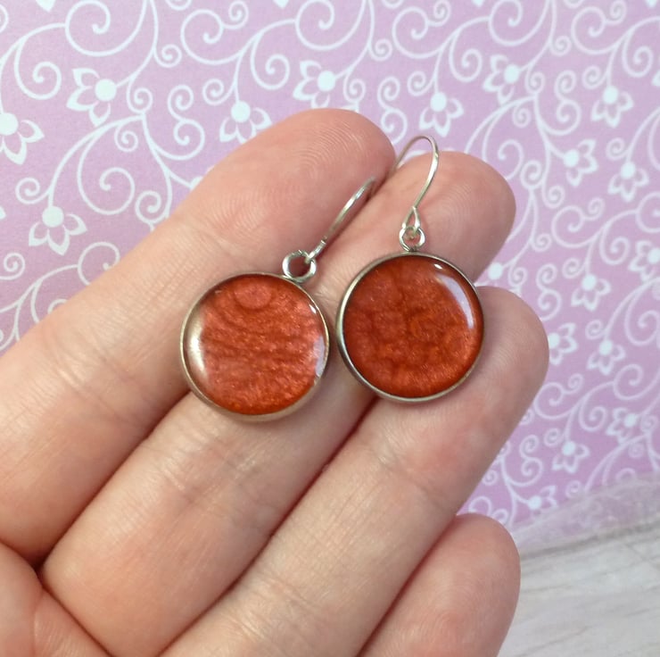 Made from a deep red enamel with a metallic sheen, these dangle earrings have hypoallergenic Stainless Steel bezels, topped with a layer of crystal clear resin to enhance the colour. The wires are also made from stainless steel.