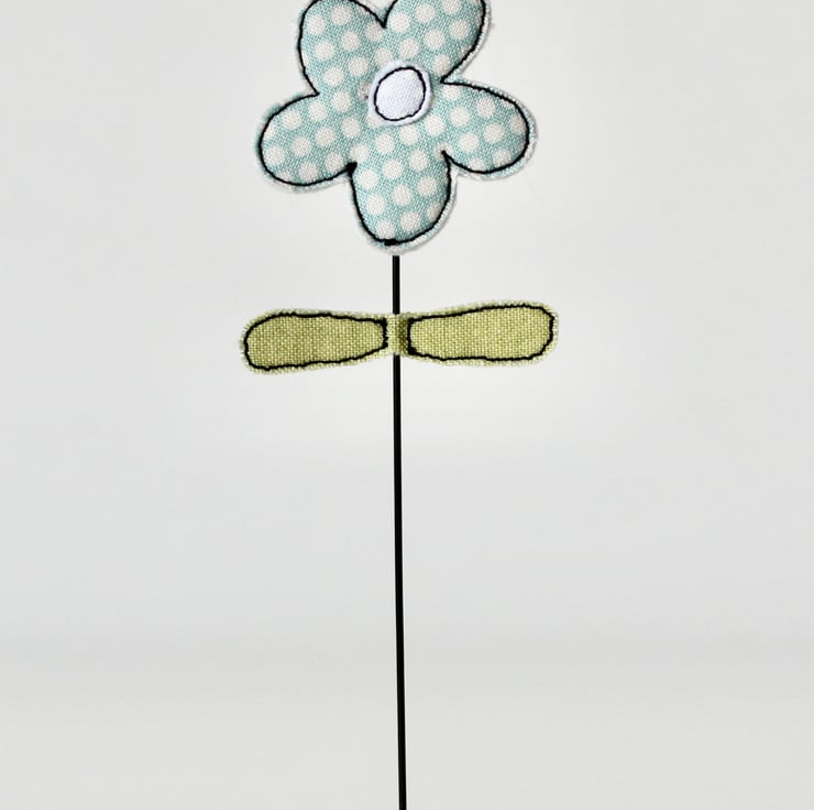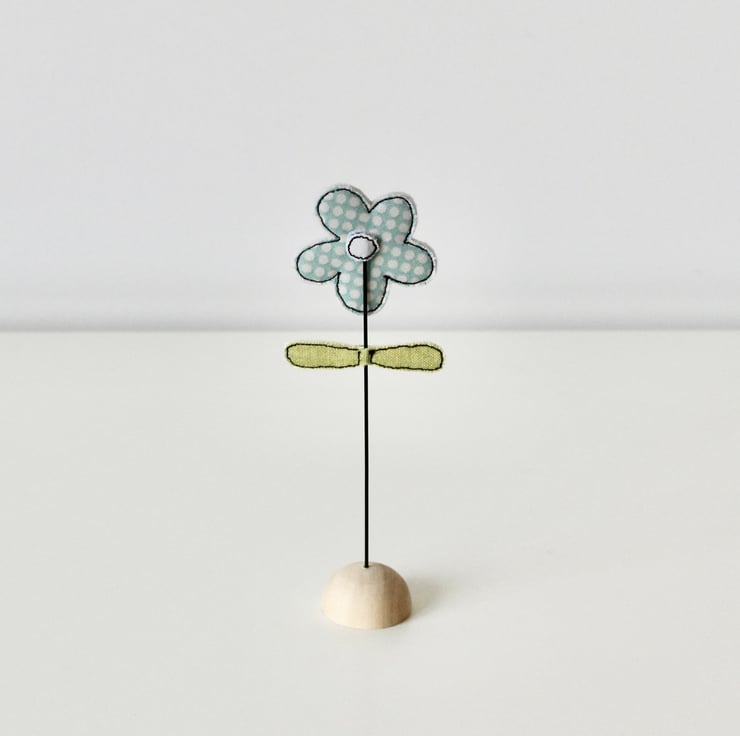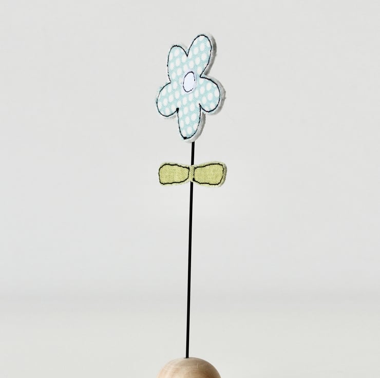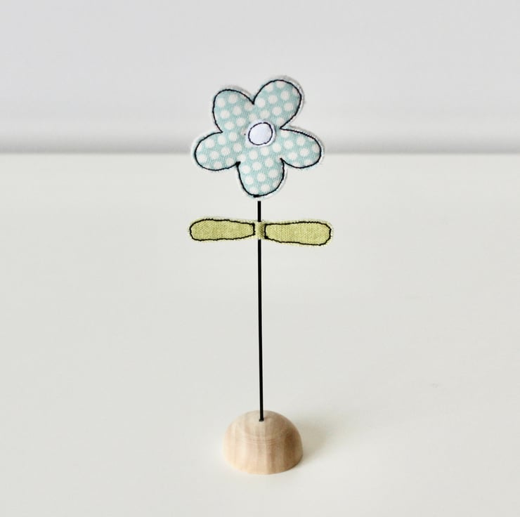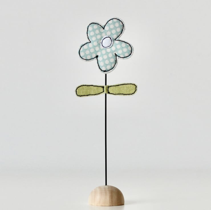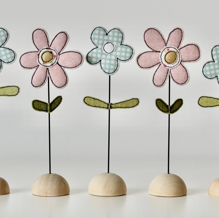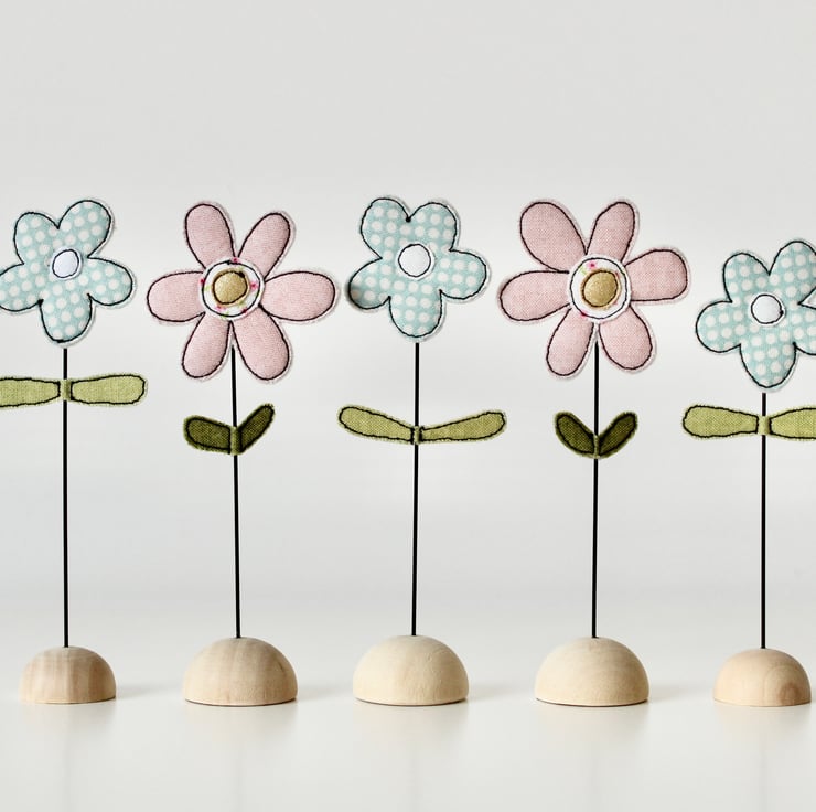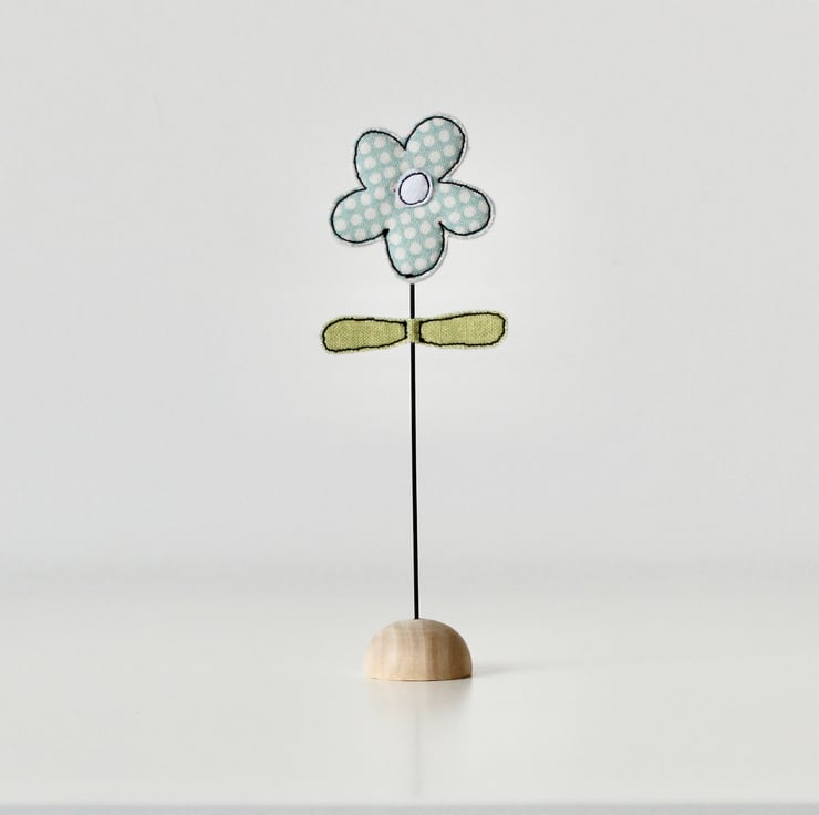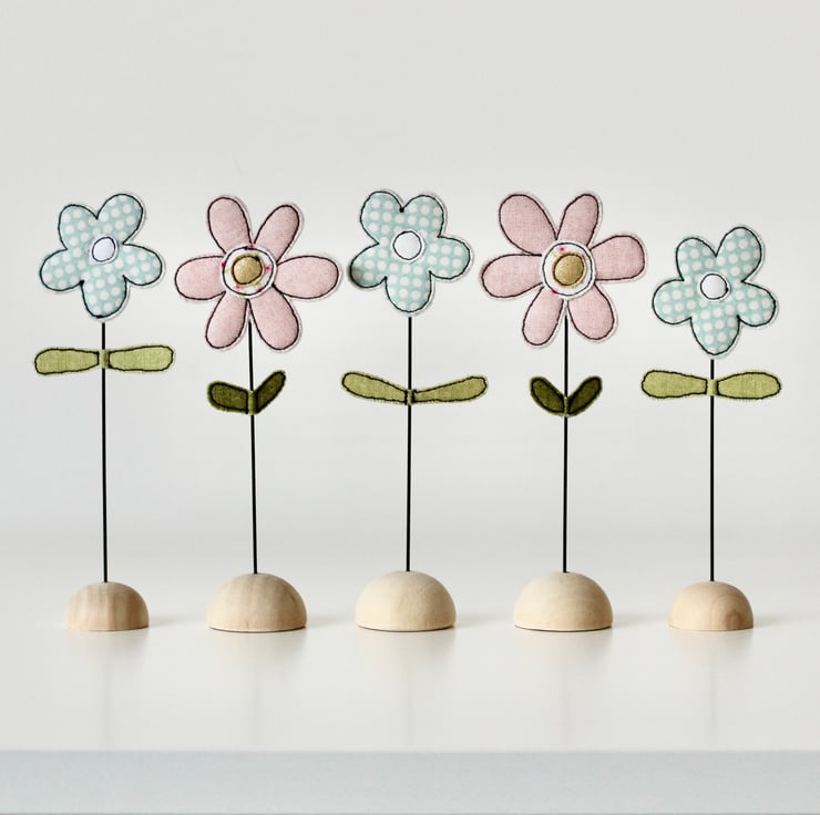 Each of the spotty flowers is sewn using a mixture of cotton cloth, 100% wool felt and free hand machine embroidery; multiple layers of cloth are sewn together and cut out by hand using very sharp scissors. Each bloom stands in a circular wooden base.