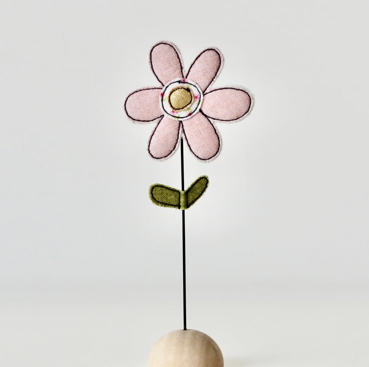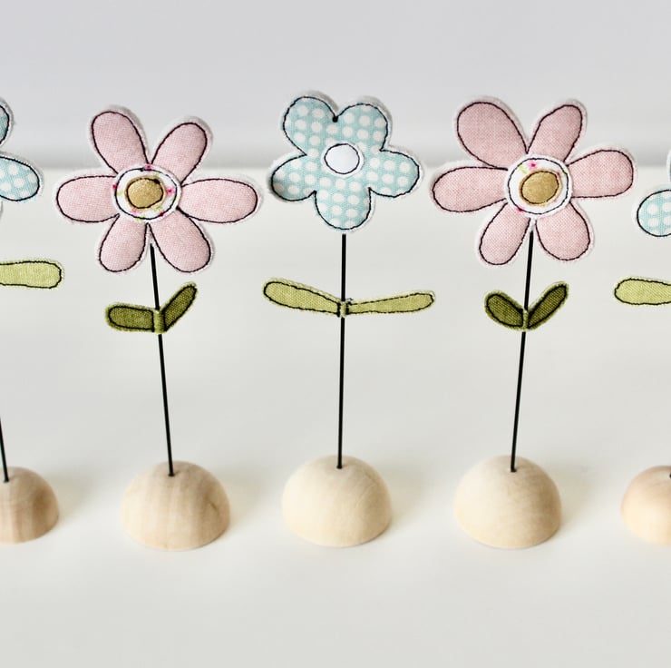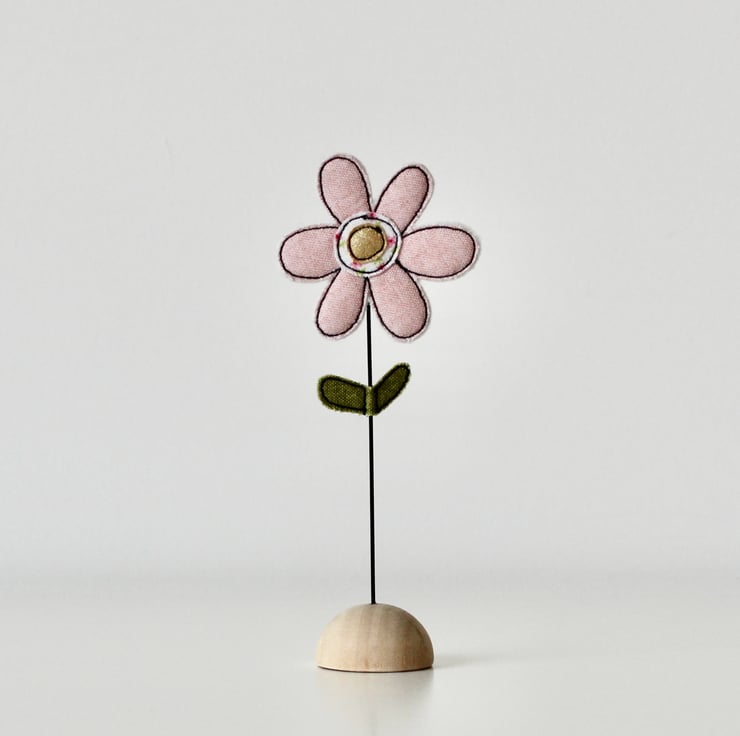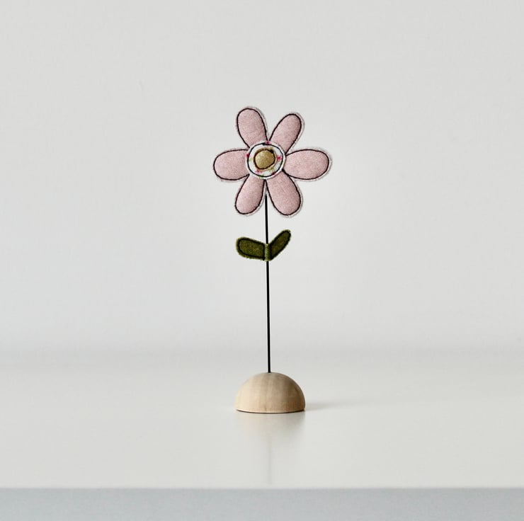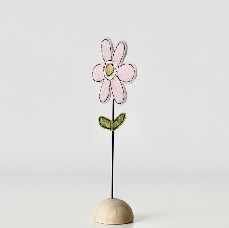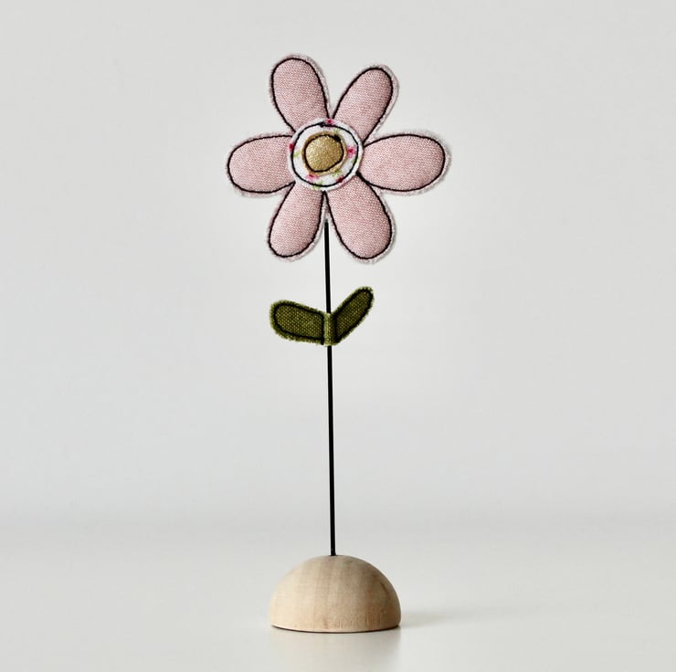 Each of the pink flowers is sewn using a mixture of cotton cloth, 100% wool felt and free hand machine embroidery; multiple layers of cloth are sewn together and cut out by hand using very sharp scissors. Each bloom stands in a circular wooden base.