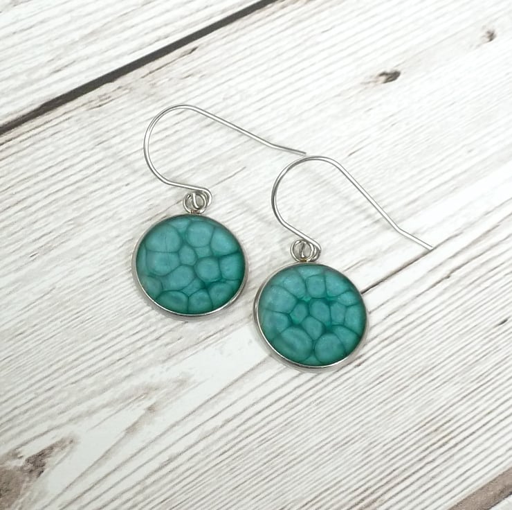 Made from a bright turquoise blue enamel with a metallic sheen, these earrings have hypoallergenic Stainless Steel bezels, topped with a layer of crystal clear resin to enhance the colour. The wires are also made from stainless steel.
