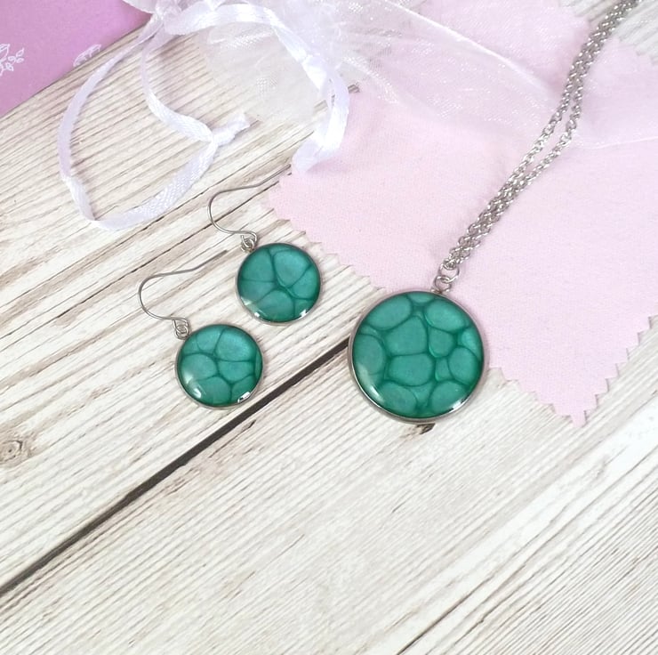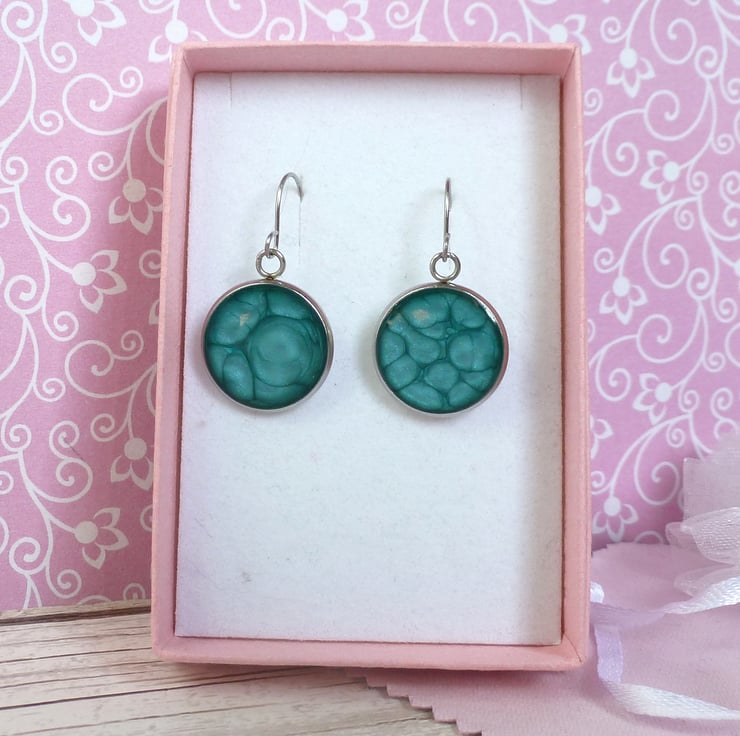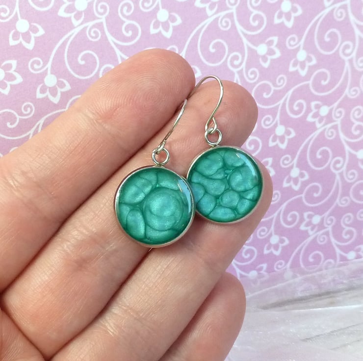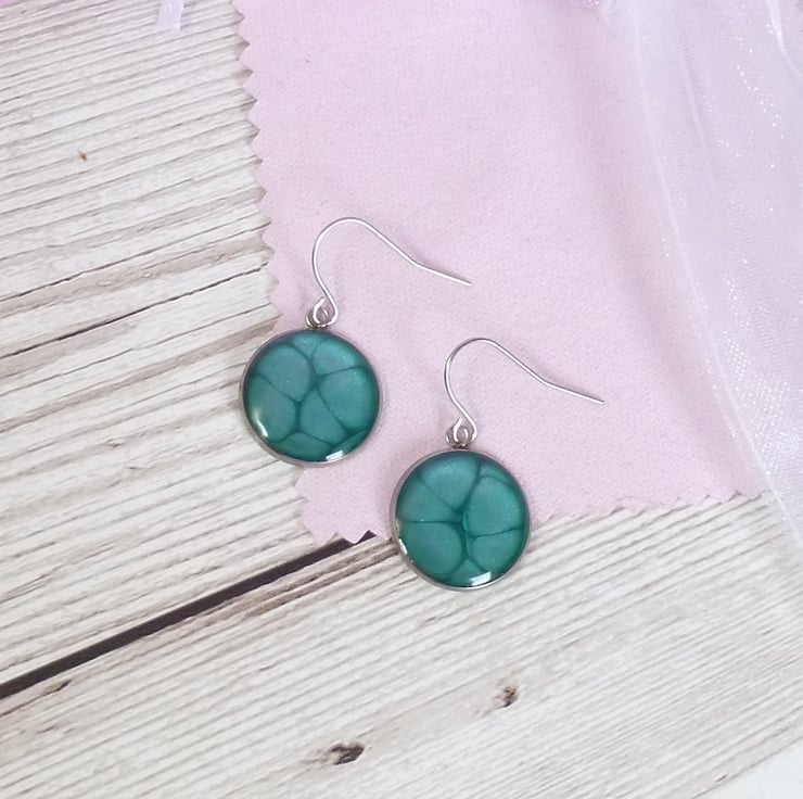 Made from a bright turquoise blue enamel with a metallic sheen, these earrings have hypoallergenic Stainless Steel bezels, topped with a layer of crystal clear resin to enhance the colour. The wires are also made from stainless steel.