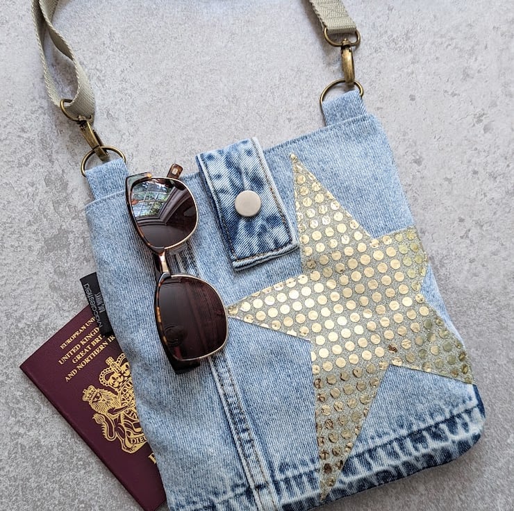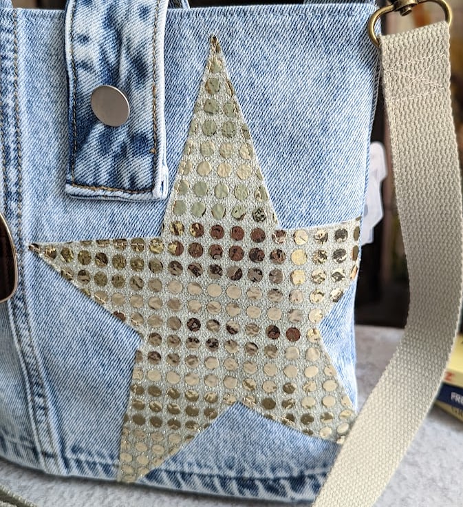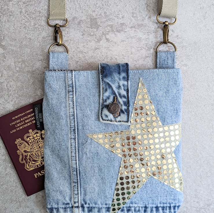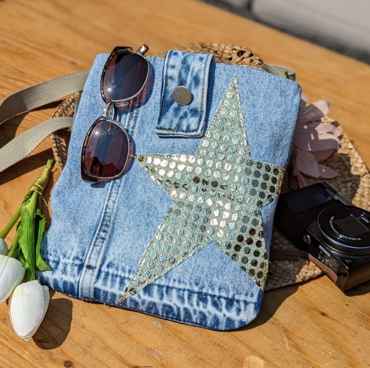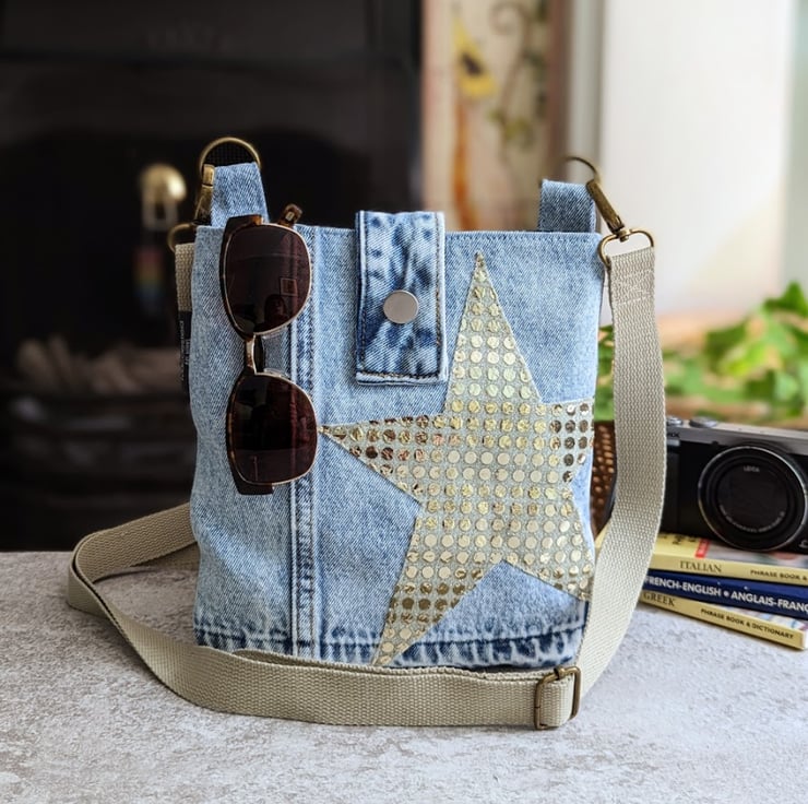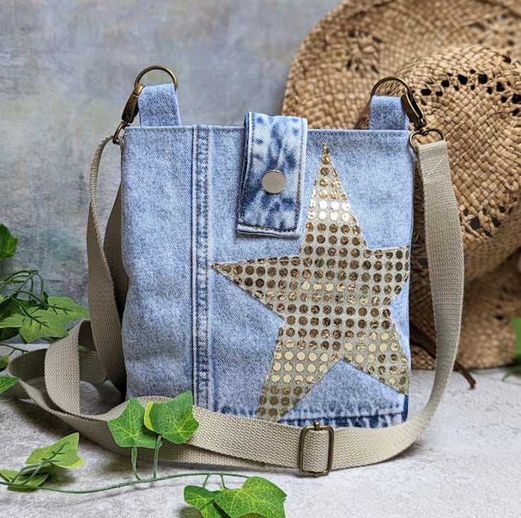 Preloved denim jeans have been upcycled to make this mini cross body bag. The gorgeous gold 'faux sequin' star motif, contrasts perfectly with the palewash denim - great for evenings, festivals or just feeling fabulous every single day! Throw in your phone, purse and a few essentials, this little bag has been designed to be light, casual and convenient.